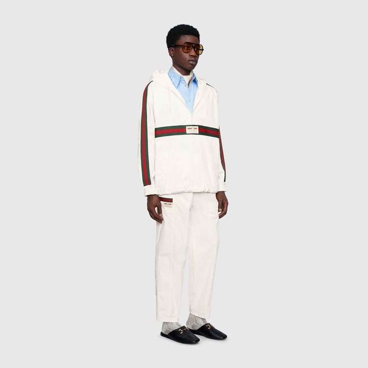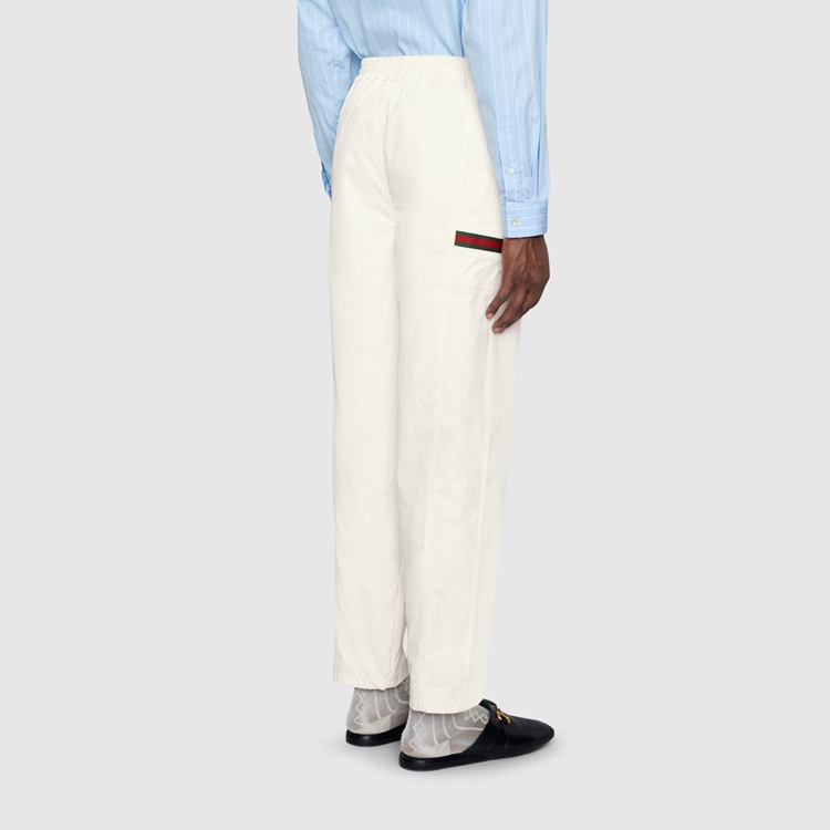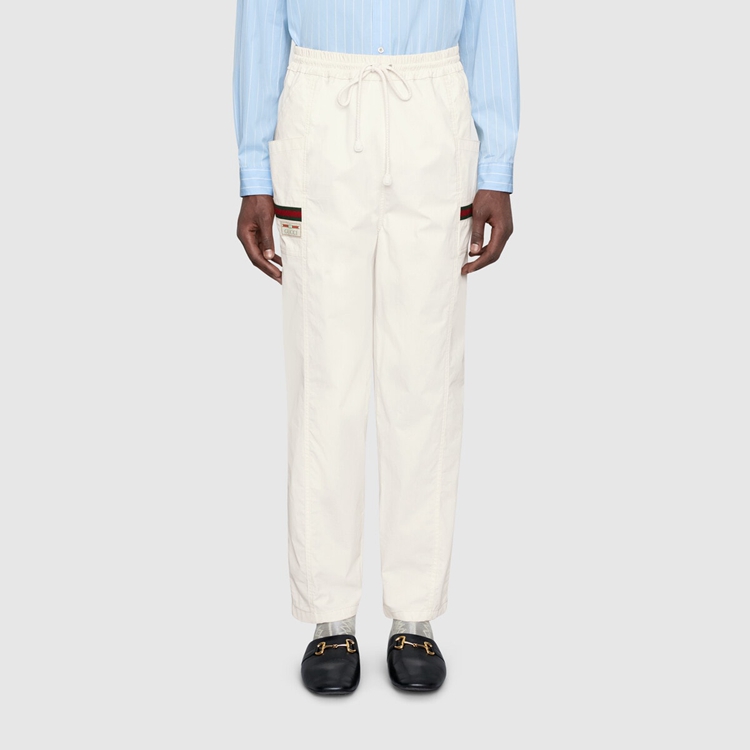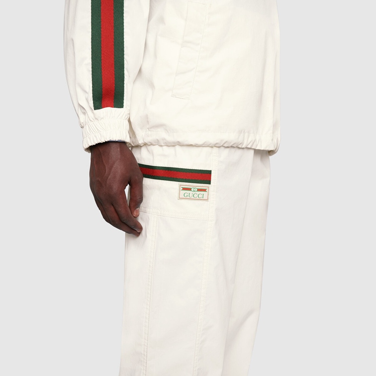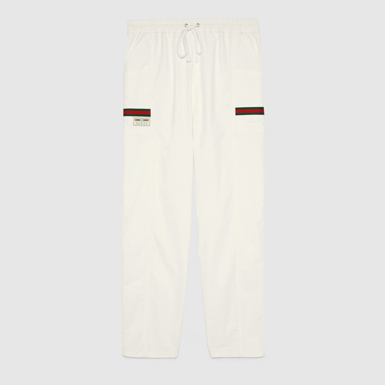 Style 604171 XDAX3 9061 Part of The concept of hybridization permeating The House’s narrative, These white cotton canvas pants feature elements pulled straight from The world of sportswear. Inspired by Classic jogging pants they have details like The elastic waistband With drawstring, and green and red ribbon details on The sides.