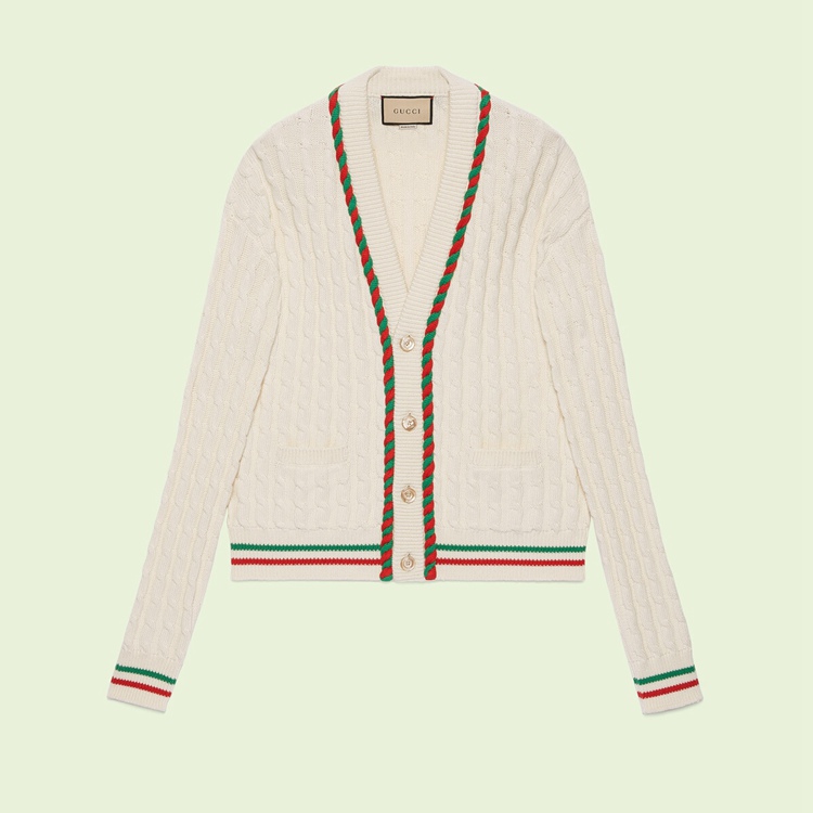 Style 692151 XKCA5 9171 The Classic red and green Color combination was originally Inspired by The chromatic range of fox-hunting jackets popular in The United Kingdom. To This day The same Color combination continues to act as a code of membership and identification and has evolved year after year. For Gucci Love Parade, The stripe is presented as a torchon detail and is paired With The Classic stripes on This ivory cableknit cardigan.