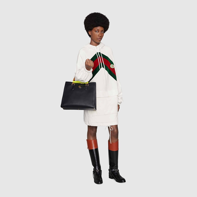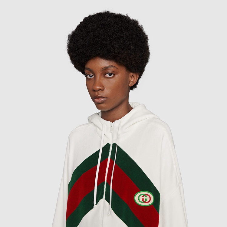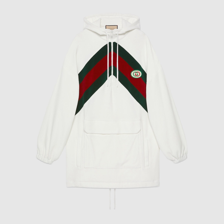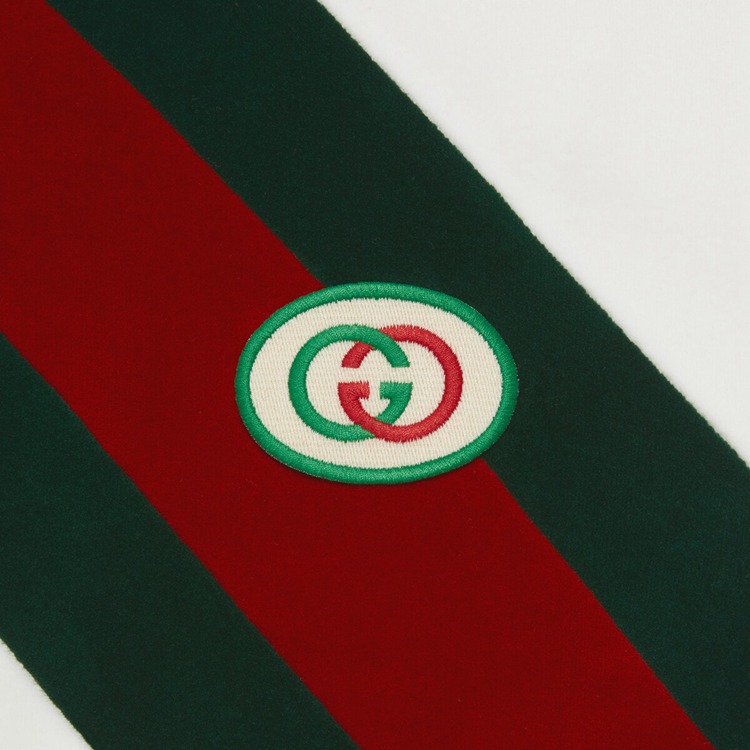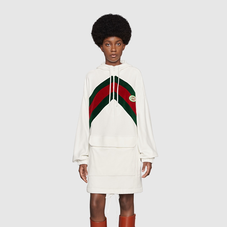 Style 678707 XJDYG 9061 Imbued With references to vintage sportswear, This cotton dress embodies The preppy influence of The collection. Trimmed With a chenille green and red chevron Web, The style is completed With an Interlocking G patch.