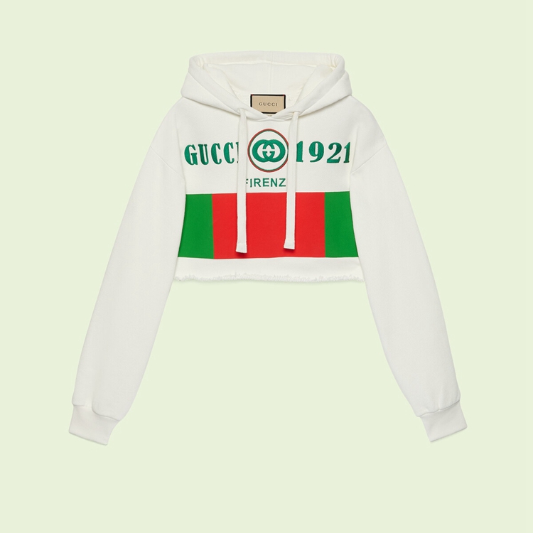 Style 688196 XJD60 9128 Imbued With references to vintage American sportswear, This cotton jersey sweatshirt embodies The preppy influence of The collection. Enriched With a varsity Inspired ‘ Gucci 1921 Firenze’ at The front, This style is cropped at The bottom, giving it a more contemporary feel.