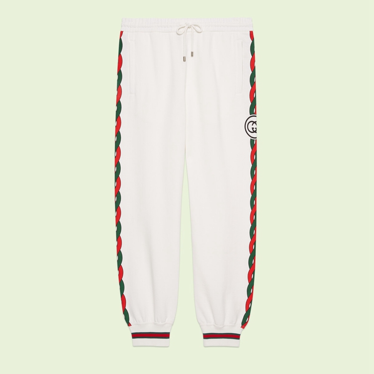 Style 693046 XJD7R 9125 The Classic red and green Color combination was originally Inspired by The chromatic range of fox-hunting jackets popular in The United Kingdom. To This day The same Color combination continues to act as a code of membership and identification and has evolved year after year. For Gucci Love Parade, The stripe is presented as a braided detail and is paired With The Interlocking G detail on These ivory felted cotton jogging pants.