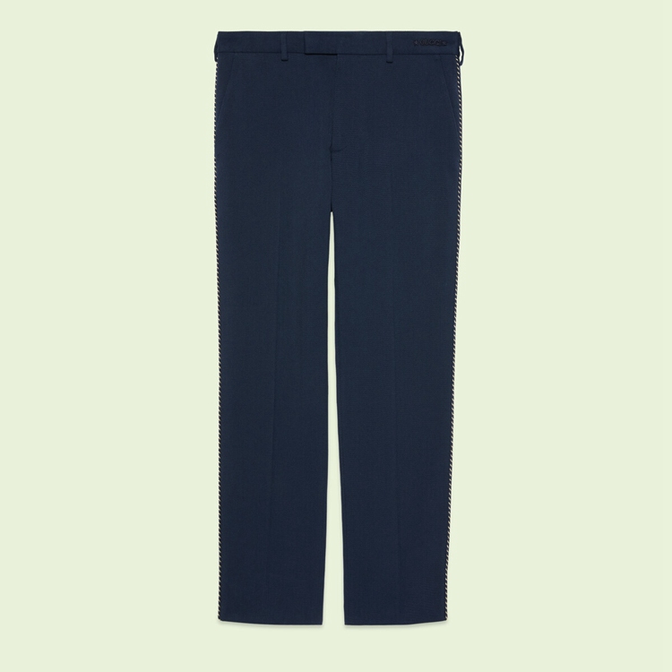Style 692934 ZABK2 4433 The star motif has long been synonymous With The House, adding a playful touch to Classic styles. For Gucci Love Parade, The cherished pattern returns as a Part of The ‘Hollywood stars’ narrative. Here, The Gucci logo is paired With stars as an embroidery on These dark blue cotton pants.