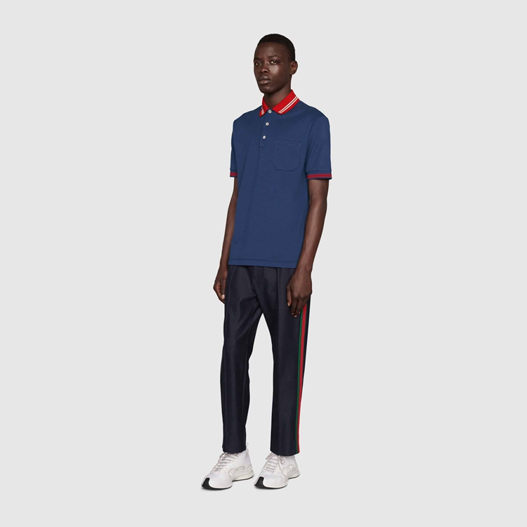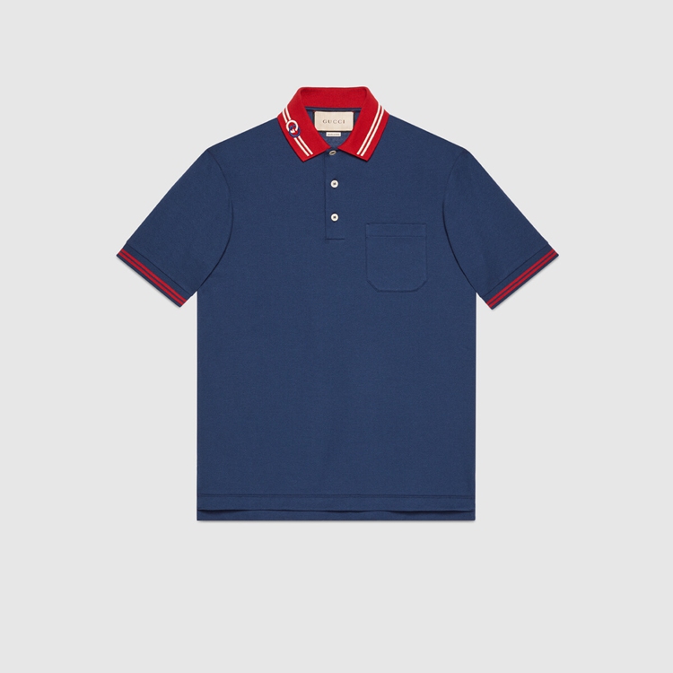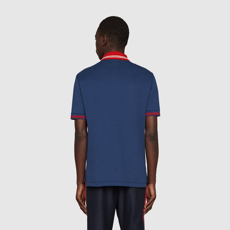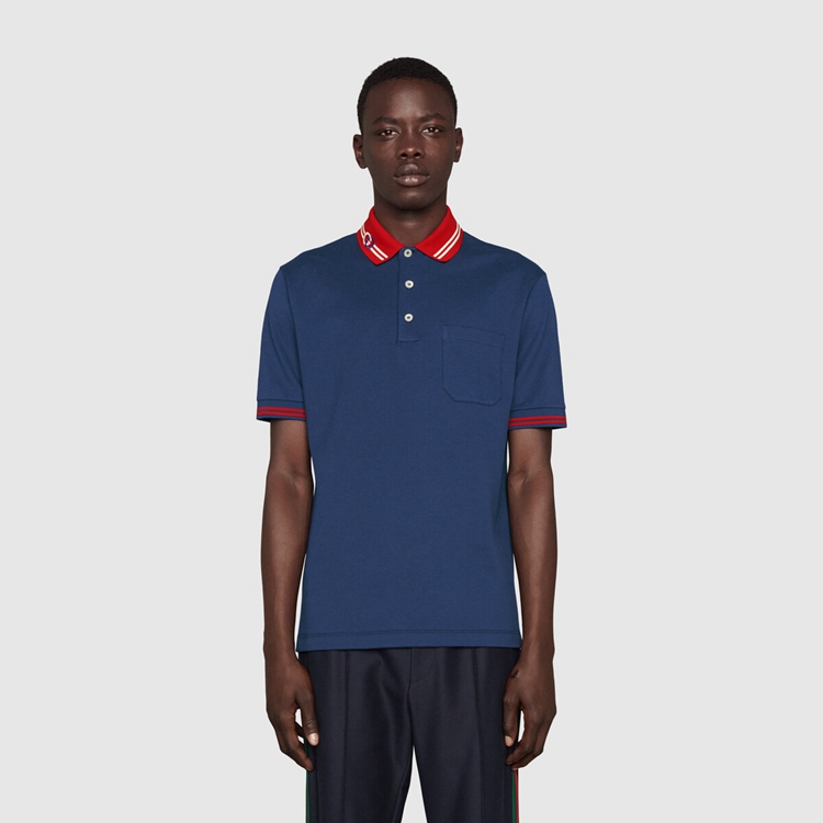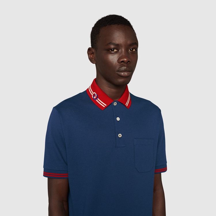 Style 658067 XJDI2 4714Defined by its contrast collar With The unmistakable Interlocking G symbol, This blue cotton piquet polo draws upon Gucci’s history.