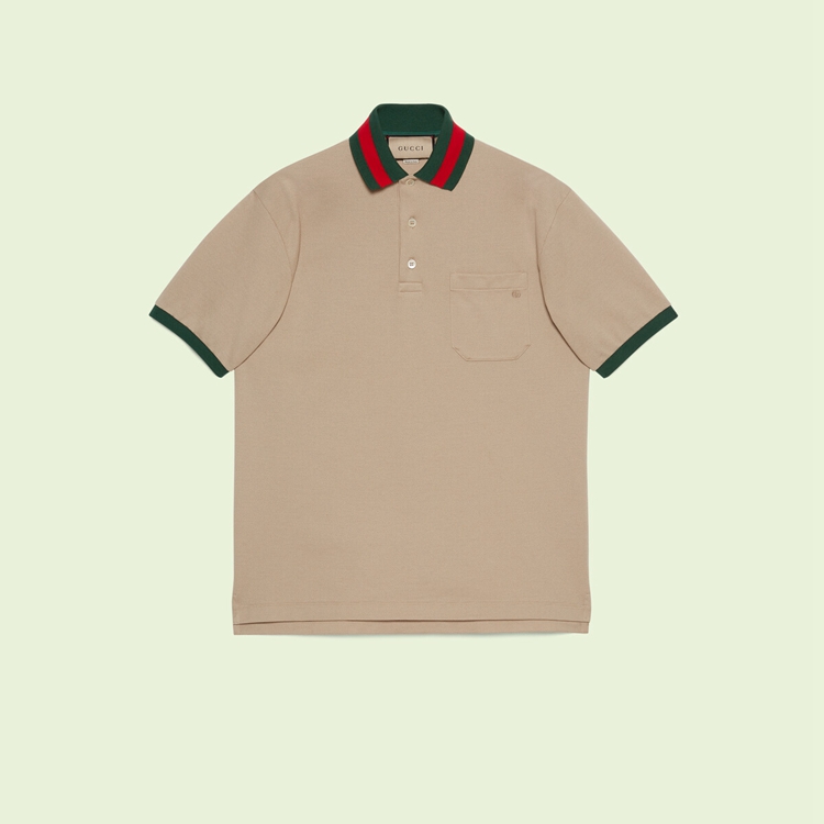 Style 701735 XJELJ 2219 The House’s Emblematic green and red Web is reworked as The collar of This cotton piquet polo shirt. The preppy influence seen throughout The House narrative continues to evolve.