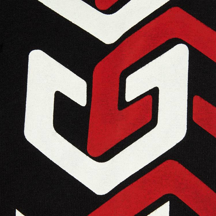 Style 676063 XJDWA 1152 A New play on The Gucci logo, This mirrored version is presented throughout The Gucci Aria collection. The print is depicted on an black cotton jersey base in an oversize fit.
