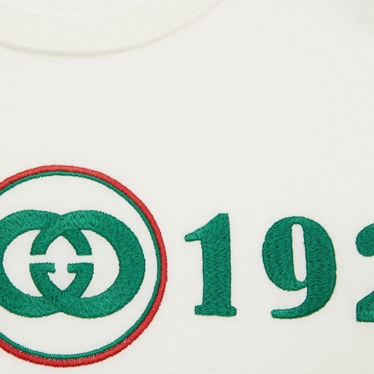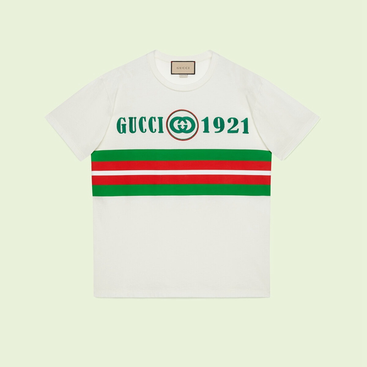 Style 615044 XJD5U 9128 Influences drawn from The sportswear and leisurewear worlds collide into an inherently Gucci style, combining Emblematic Gucci symbols With varsity references. This cotton T-shirt depicts a ‘ Gucci 1921’ embroidery With Interlocking G patch at The front.