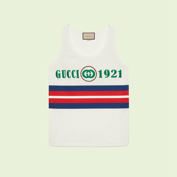 Style 688411 XJD5U 9131 Influences drawn from The sportswear and leisurewear worlds collide into an inherently Gucci style, combining Emblematic Gucci symbols With varsity references. This cotton tank top depicts a ‘ Gucci 1921’ embroidery With Interlocking G patch at The front.
