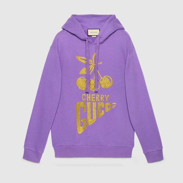 Style 615061 XJDZJ 5637 Part of The Gucci references to pop culture, fruits in all shapes and forms continues to enrich The House’s narrative. For Aria, they appear as playful prints, often enriching a selection of ready-to-wear pieces. This light purple cotton sweatshirt is animated by a crystal ‘Cherry Gucci’ print.