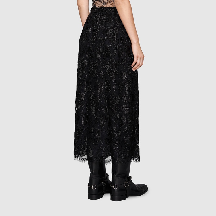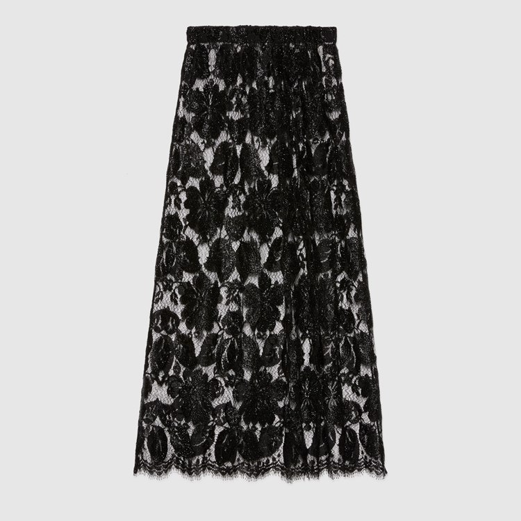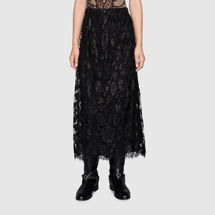 Style 672105 ZAH2X 1000 A mid-length skirt Crafted from black lamé flower lace With crystal embroidery. Imbued With references from Gucci’s glamour-infused Tom Ford era, Aria redefines The idea of femininity With hints to The concept of freedom that fashion experienced in The ’90s. Lace, sheer fabrics and crystals appear throughout The collection, contrasting With oversized fits For a contemporary feel.