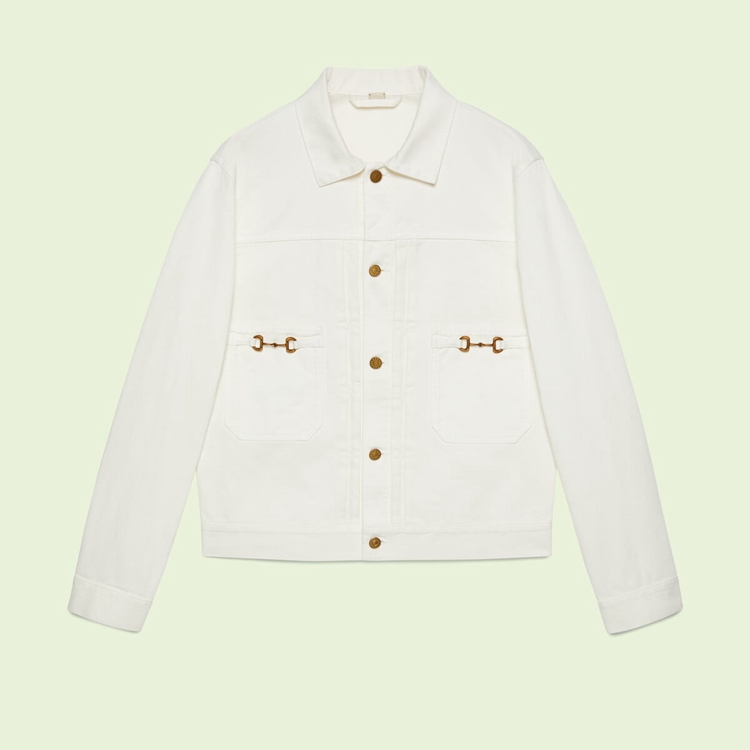 Style 669602 XDBYK 9133 Gucci makes a strong statement in denim, reworking The cult fabric in different shapes and treatments. Imagined as a complement For layered looks, This jean jacket is presented in white cotton denim, With an underground appeal balanced by Horsebit details on The pockets. The House’s most Emblematic codes from The archives are rejuvenated in a refreshing mix of Classic and contemporary that speak to a New aesthetic.