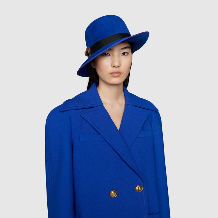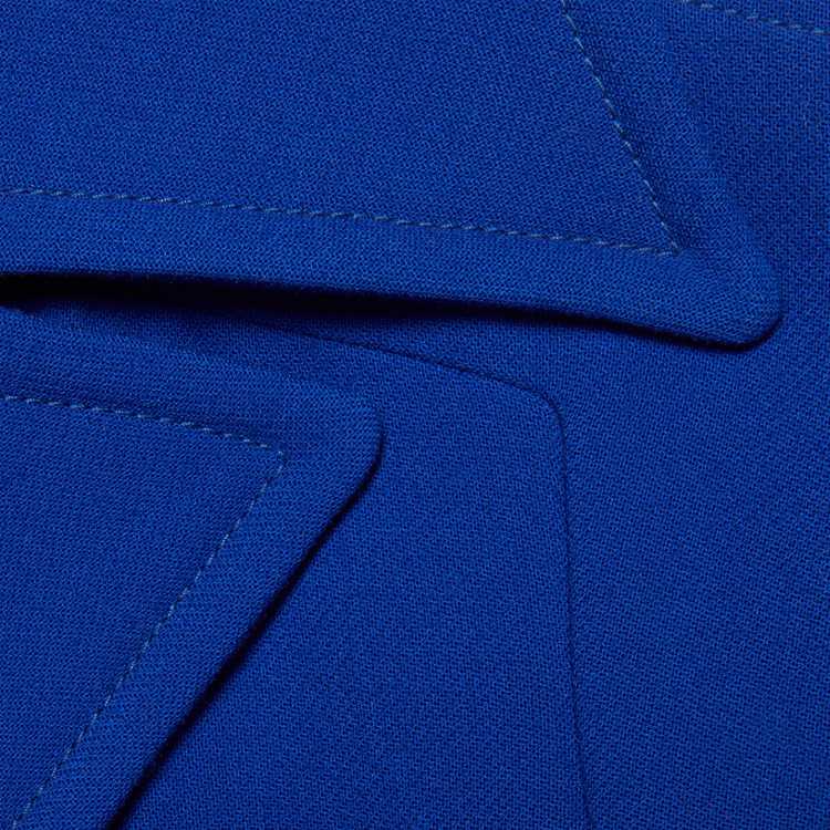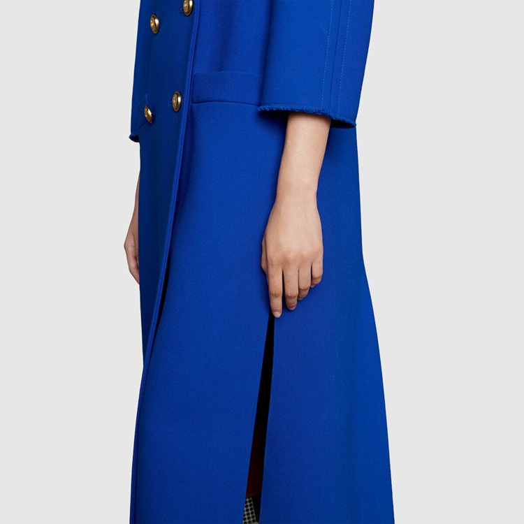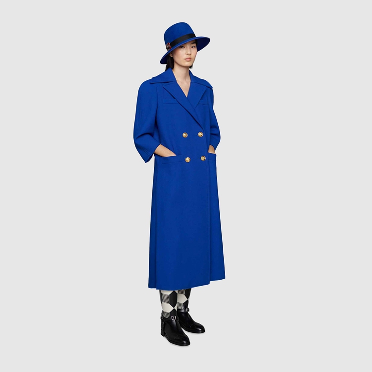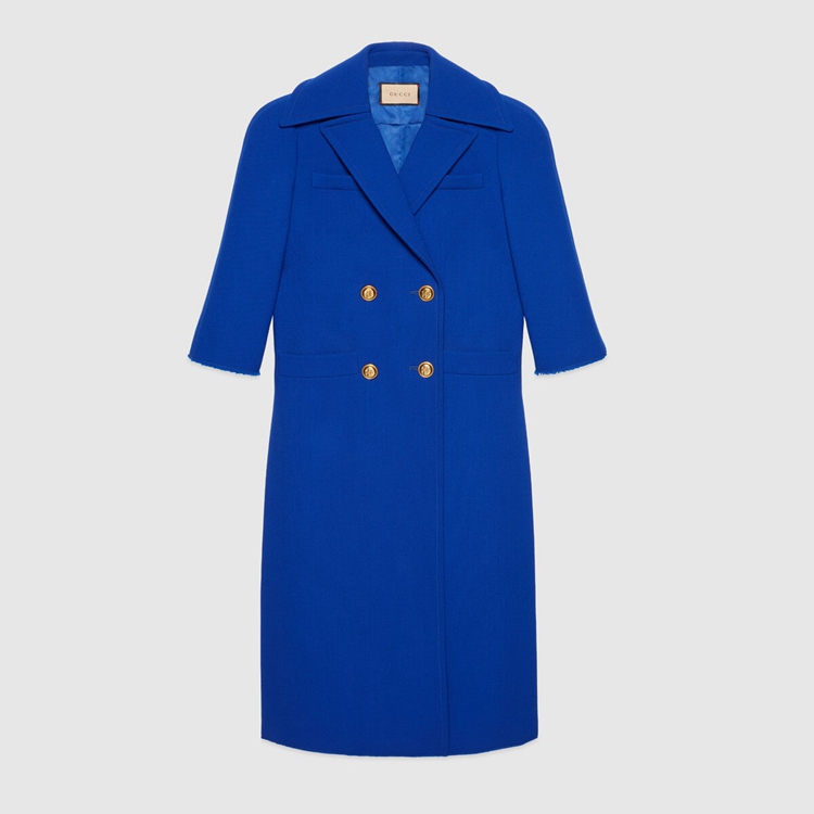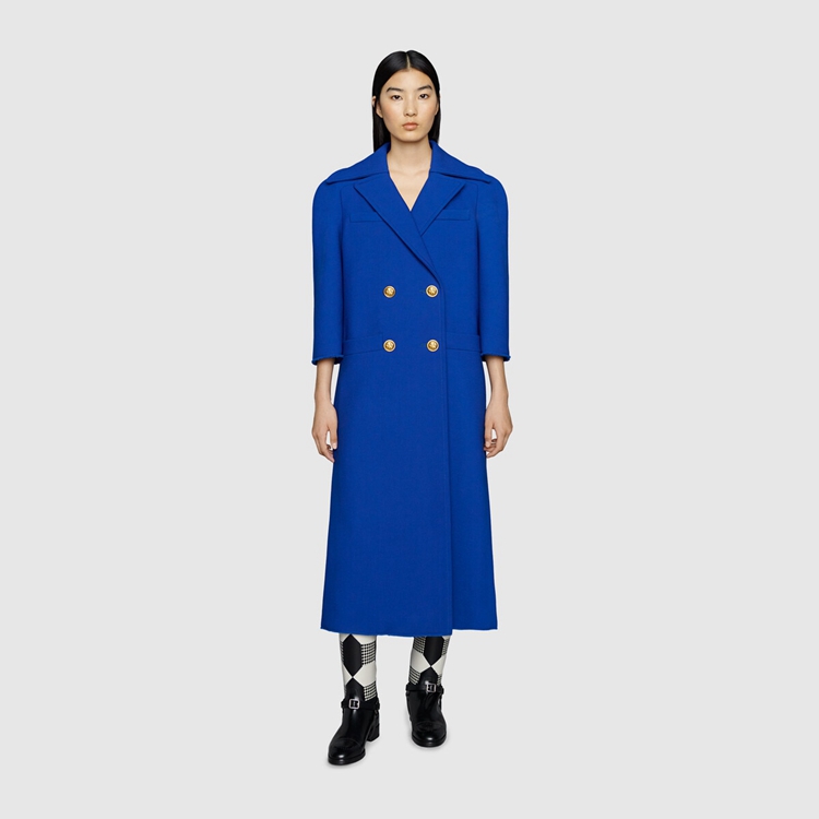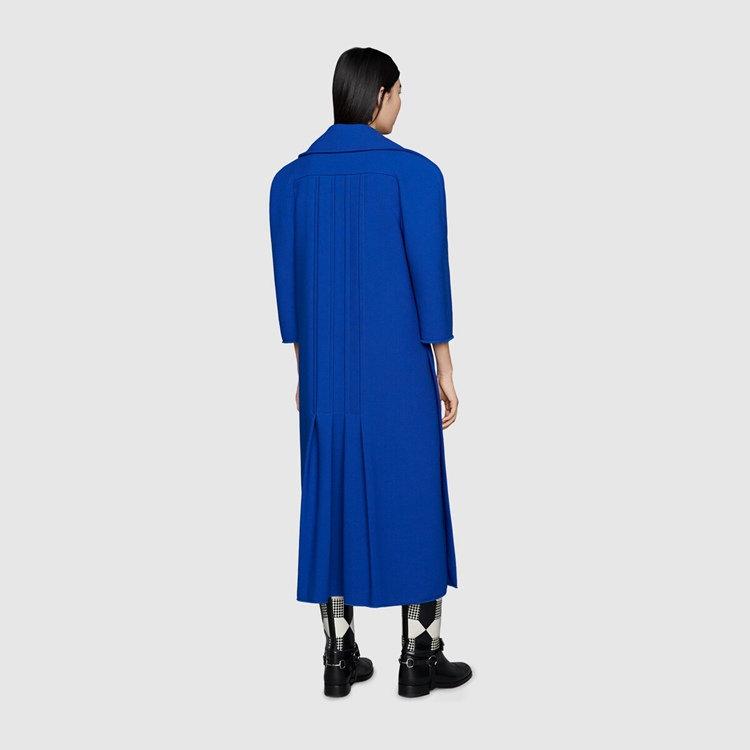 Style 669523 ZHW10 4096Designed With pleats on The back, This style reflects The idea of hybridization explored in The House’s collections. Imbued With a Retro Inspired feel, The double-breasted electric blue wool coat is completed With gold-toned hammered buttons.