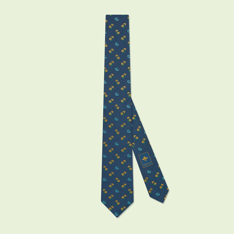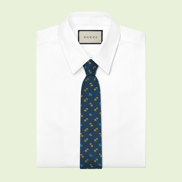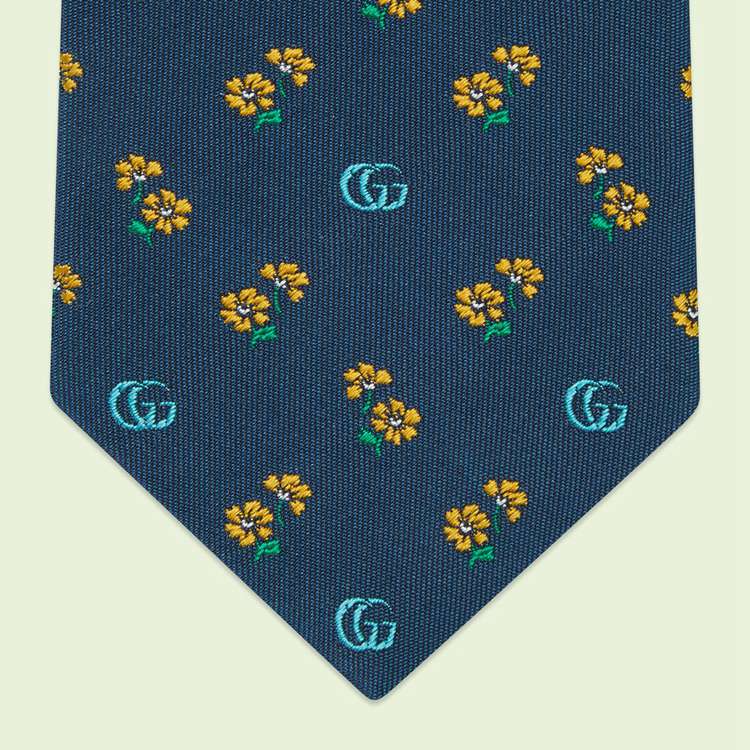 Style 695389 4E002 4375 Emblematic motifs and symbols synonymous With The House combine to enrich silk accessories, continuing The Gucci narrative seen in The ready-to-wear collection. Here, The unmistakable Double G motif appears alongside delicate flowers atop This royal blue silk tie as a yellow jacquard detail.