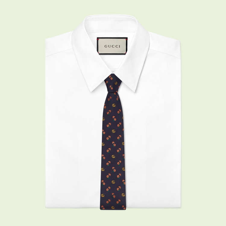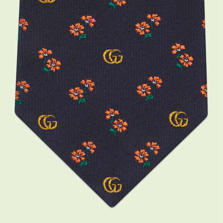 Style 695389 4E002 4076 Emblematic motifs and symbols synonymous With The House combine to enrich silk accessories, continuing The Gucci narrative seen in The ready-to-wear collection. Here, The unmistakable Double G motif appears alongside delicate flowers atop This blue silk tie as a vibrant jacquard detail.