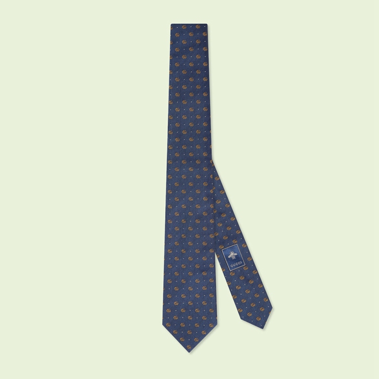 Style 699659 4E002 4275 The Emblematic Double G logo, resurrected from The ’70s archives, enriches The men’s silk accessories selection. A yellow rendition decorates This blue silk jacquard tie, interspersed With polka dots For a whimsical finish.