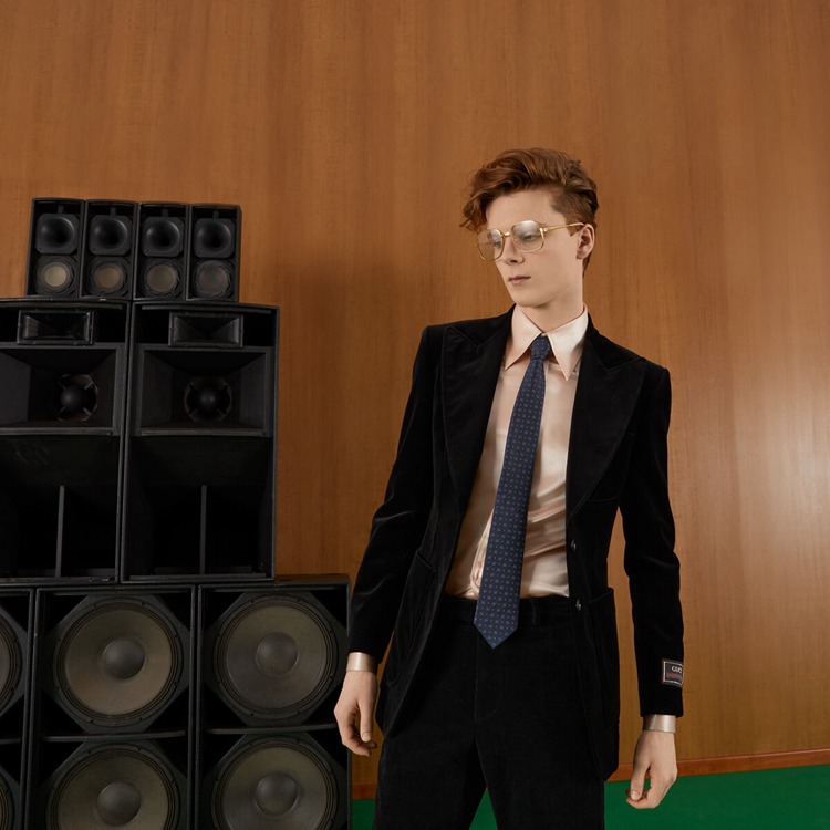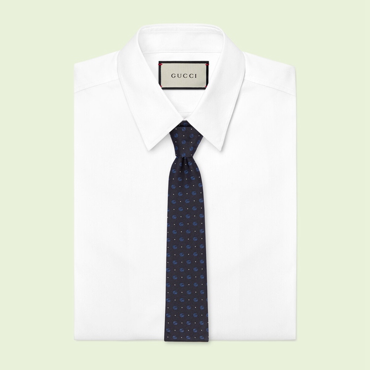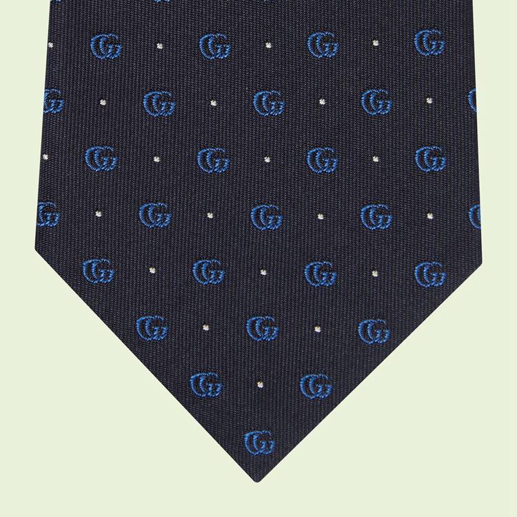 Style 699659 4E002 4068 The Emblematic Double G logo, resurrected from The ’70s archives, enriches The men’s silk accessories selection. A light blue rendition decorates This dark blue silk jacquard tie, interspersed With polka dots For a whimsical finish.