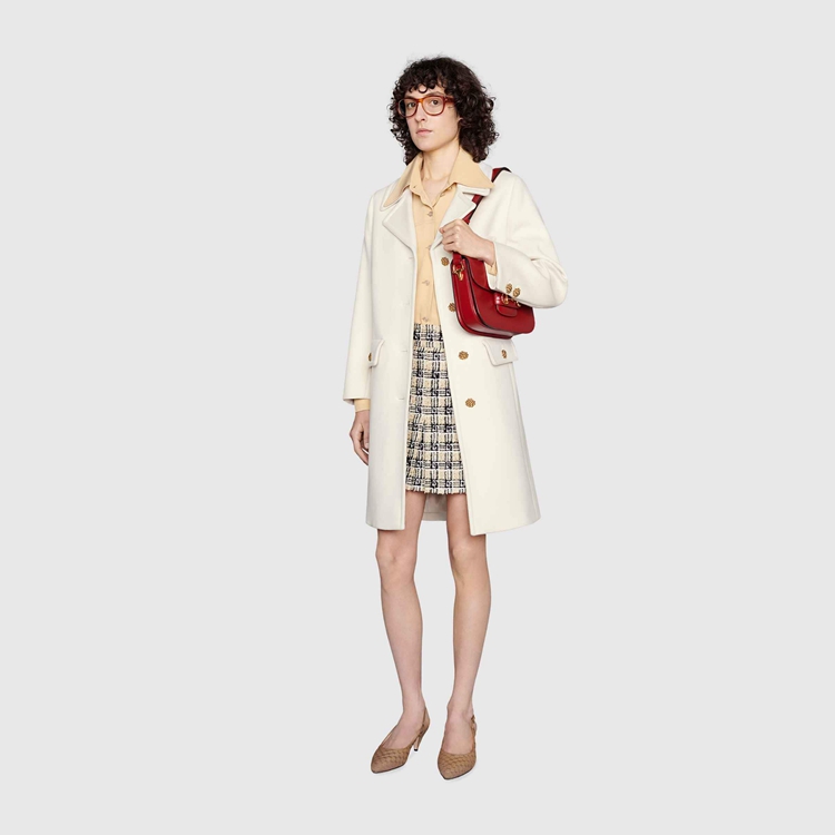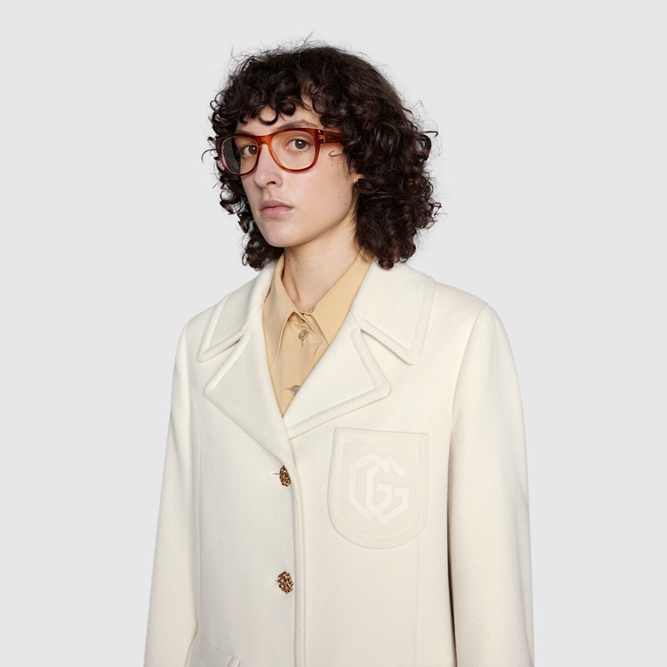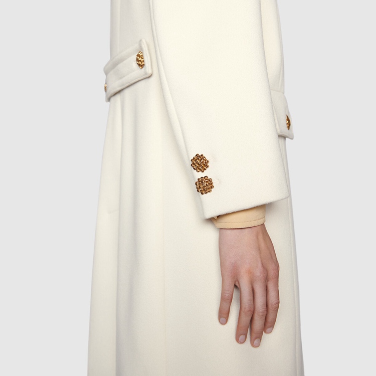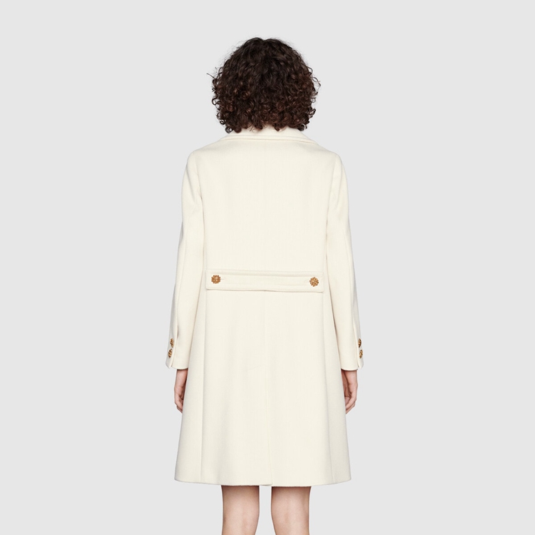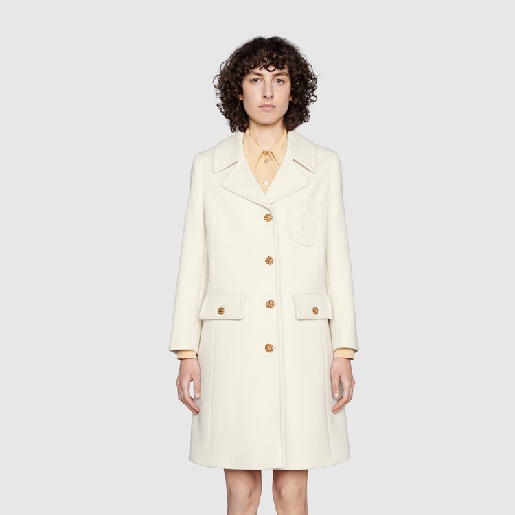 Style 657054 ZAG3M 9205Enriched by a tonal Double G embroidery, This off-white wool coat speaks to a contemporary aesthetic, blending streamlined shapes and details from The past. For Ouverture, an unexpected mix of materials, colors, and textures defines winter silhouettes. Coats With a Retro styling With wide lapels and contrast colored buttons appear throughout The collection, a reference to The vintage themes found in The Creative Director’s designs.
