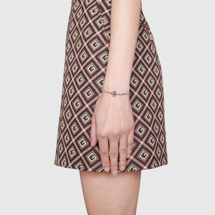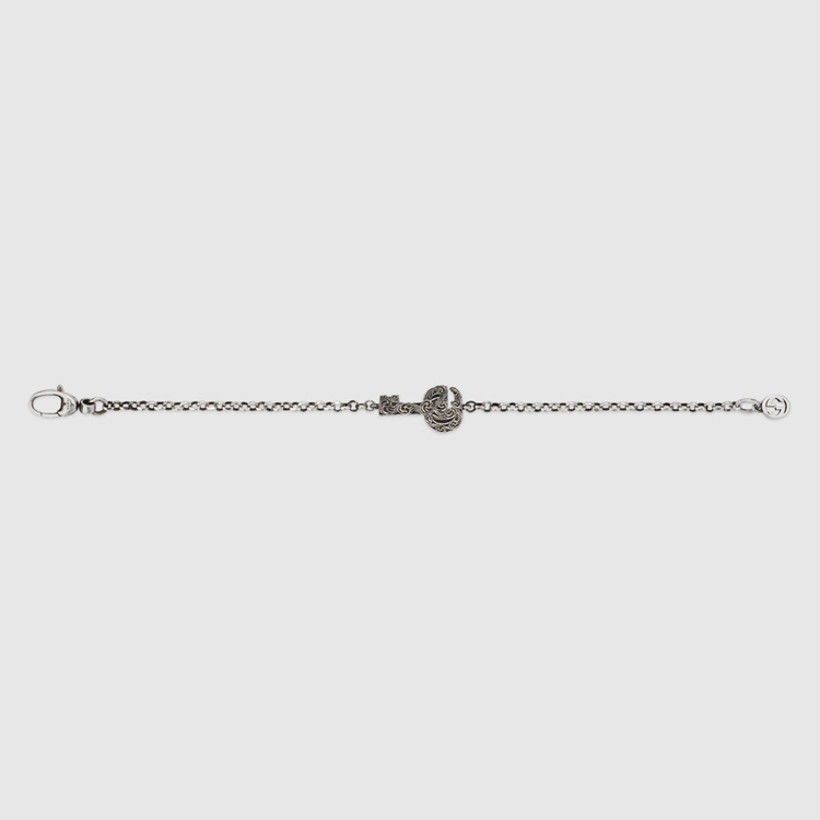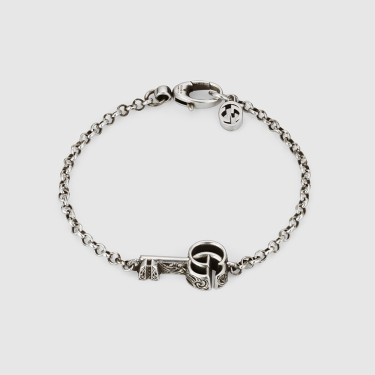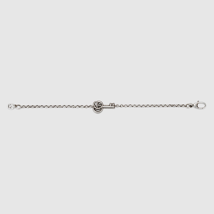 Style 632207 J8400 0701 This sterling silver bracelet, With an aged finish, features a key With The now recognizable Double G as The top piece. Expertly made and intricately designed, often With subtle nods to The House, Gucci’s silver jewelry collection is presented in an array of contemporary and Classic pieces.