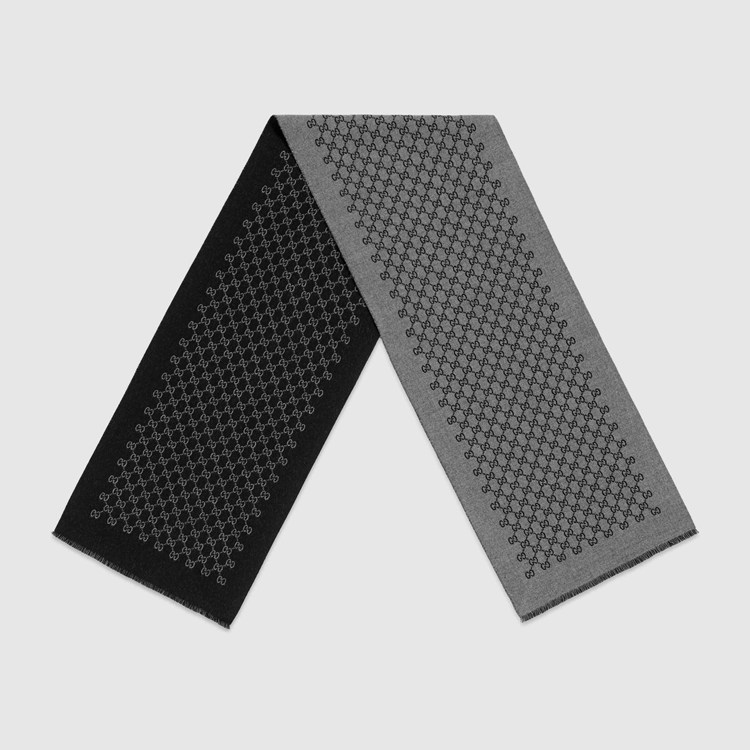 Style 391246 4G200 1160Made from soft, lightweight wool, This double jacquard scarf features an allover GG pattern on both The front and back in reverse colors.