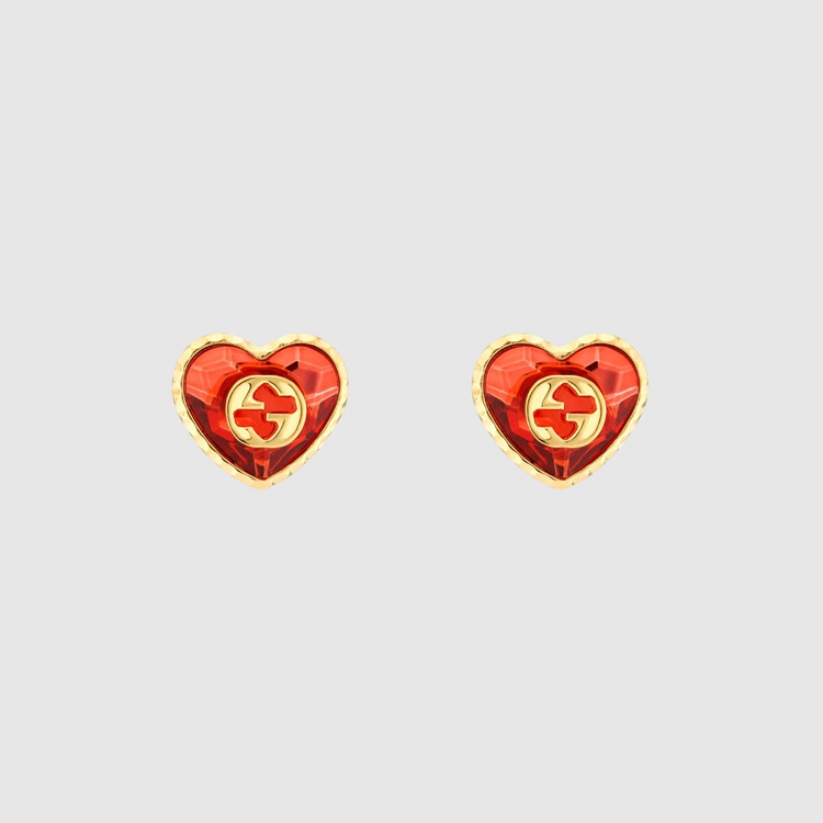 Style 648836 J1D50 8132 The Interlocking G symbol has come to be synonymous With The rich and illustrious history of Gucci, and continues to serve as an inspiration For Designs that sidestep The Typical boundaries of fashion. On This pair of earrings, it is encased Within heart-shaped red crystals framed by ribbon-effect metal details.
