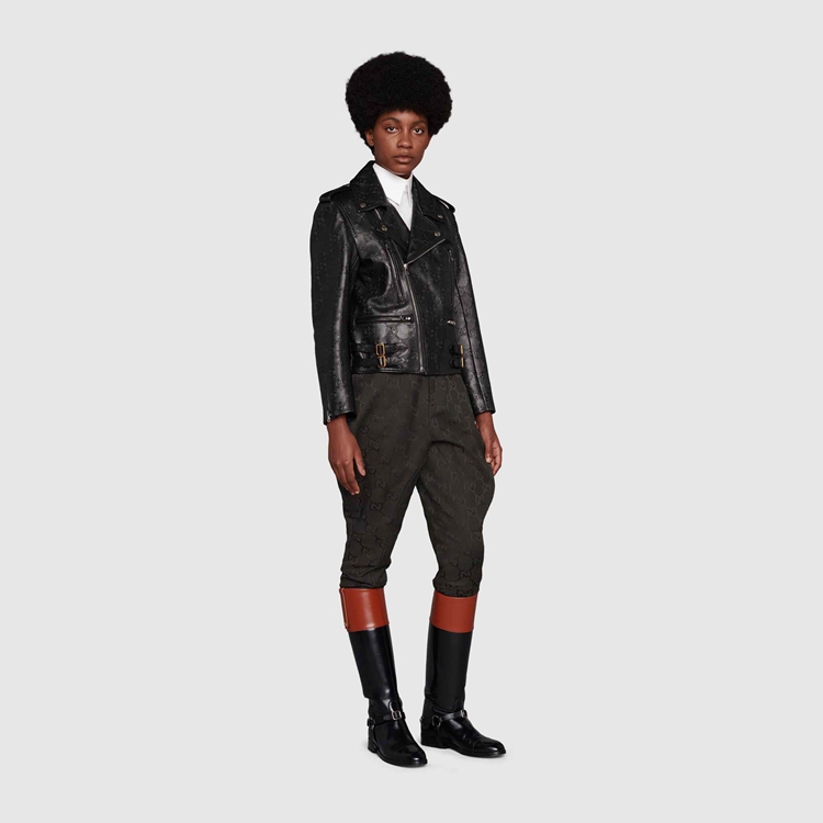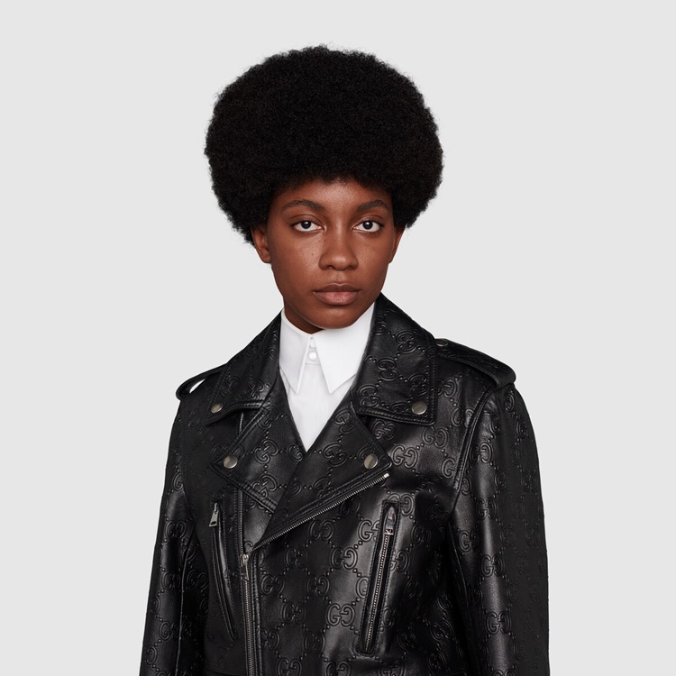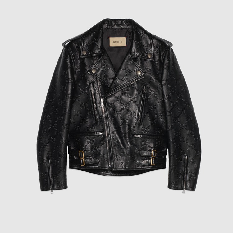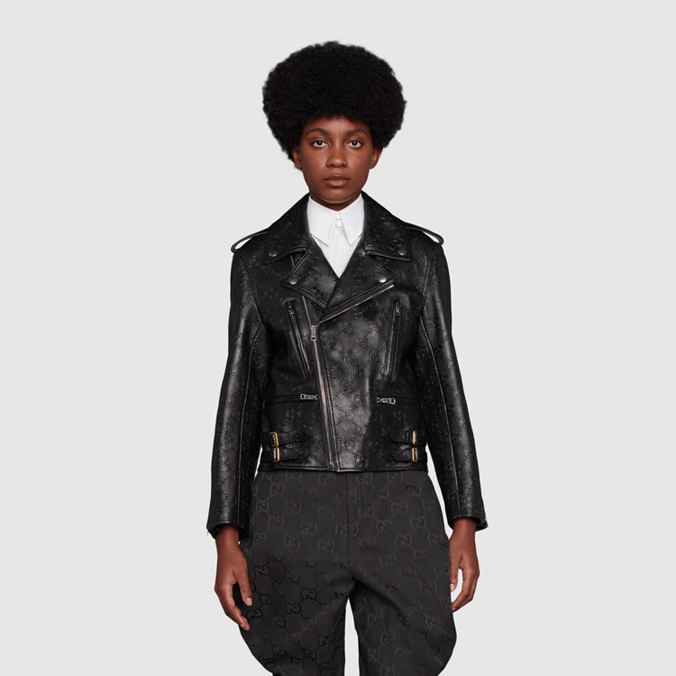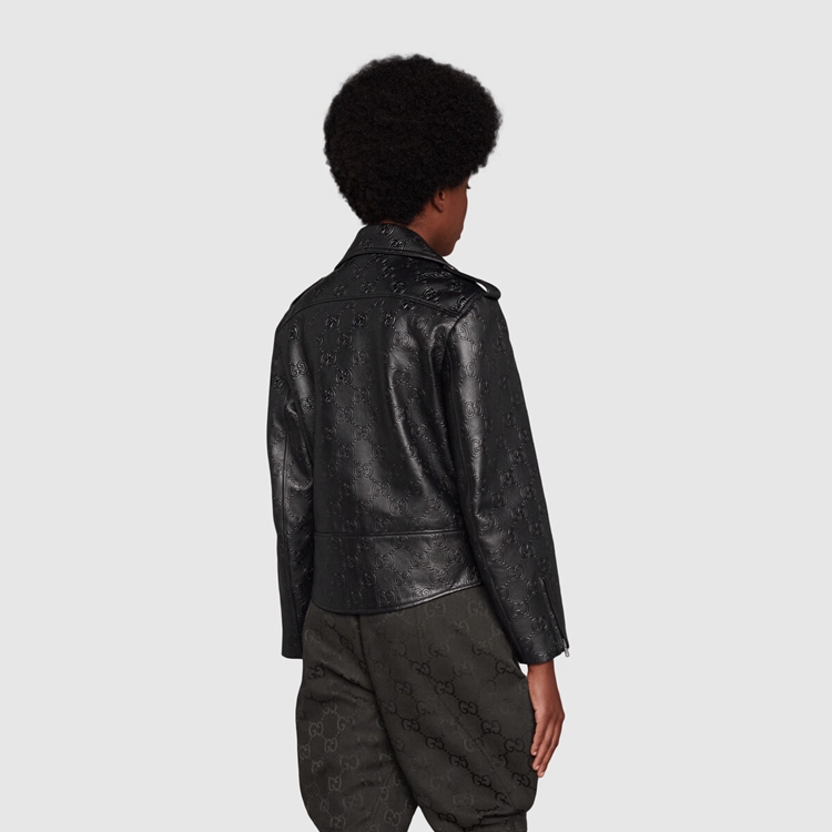 Style 671268 XNAPN 1000 A cult ready-to-wear piece, The biker jacket is presented in black embossed GG leather, enhanced by buckle strap and zip details. The GG motif is a subtle nod to The theme of reinvention that appears throughout The House’s narrative. First used in The ’70s, The monogram is an evolution of The Gucci Rhombi design—a pattern from The ’30s’ archives.