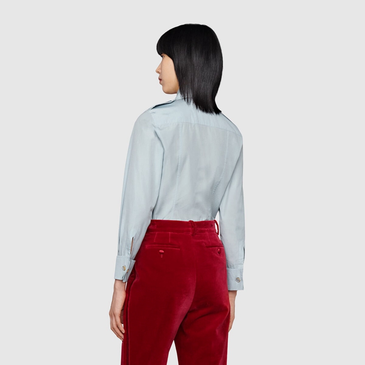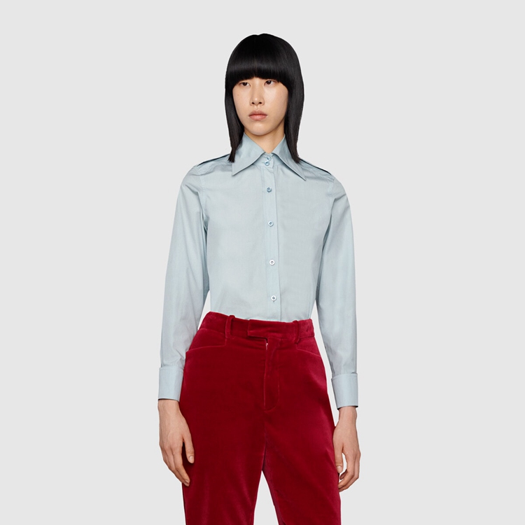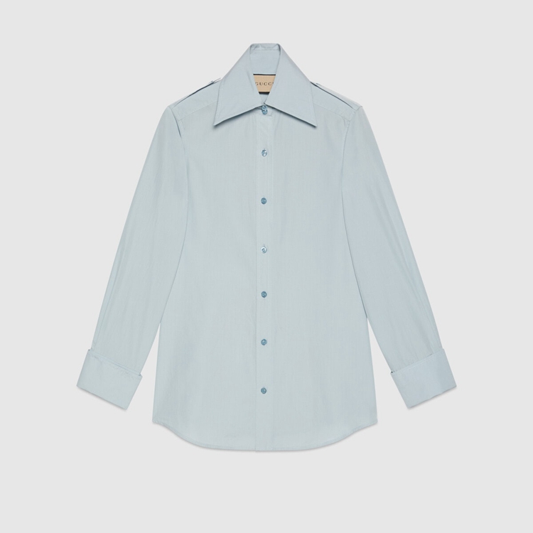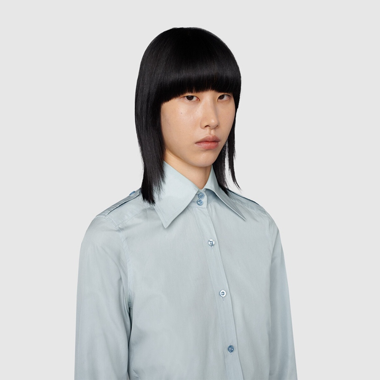 Style 675614 Z3599 4636 A concept continuously explored by The Creative Director, tailor- Inspired pieces combine sartorial excellence and an eclectic vision. On This light blue shirt, a point collar recalls The silhouettes of The ’70s, referencing The House’s fascination With The past.