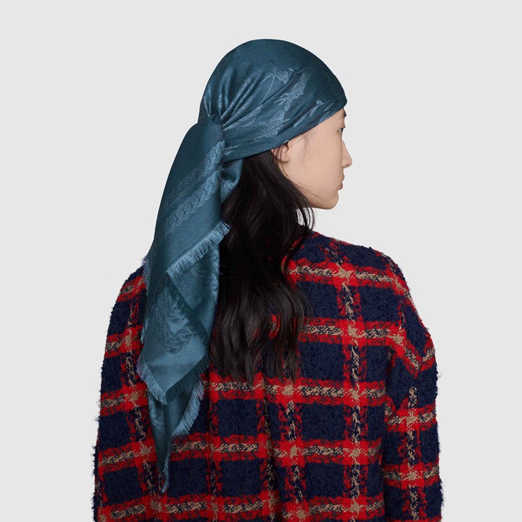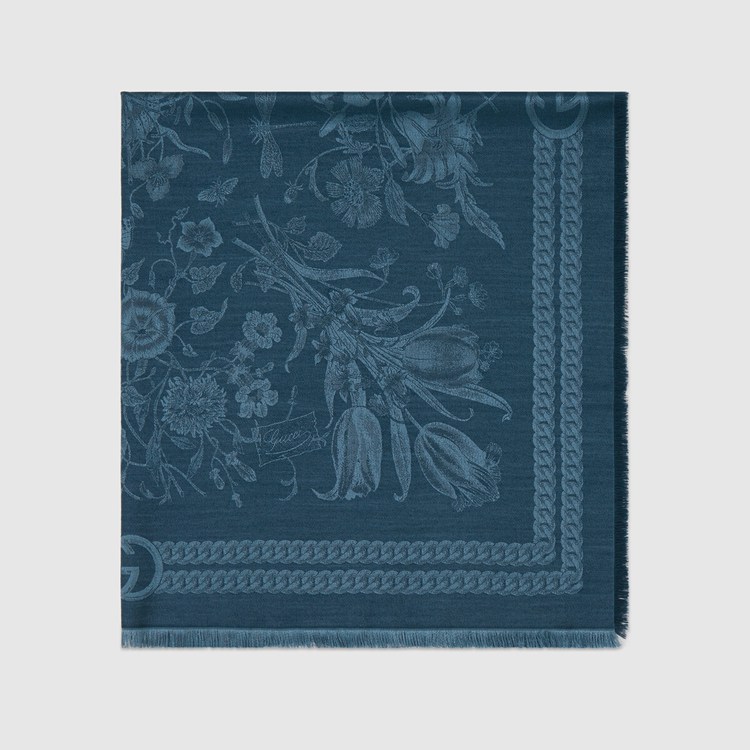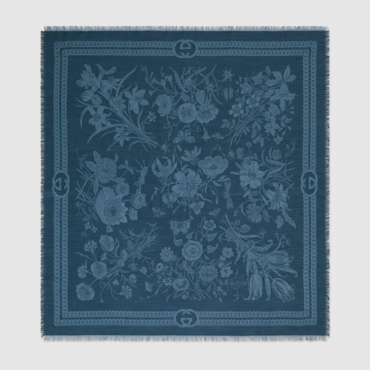 Style 676320 3GAD7 4200 The historic Flora motif, first presented by Vittorio Accornero more than 50 years ago appears here as a light blue silk jacquard. Deepening The connection to Gucci’s heritage, The Interlocking G completes The scarf’s design as an intricate logo pattern. Pieces With versatile ways to wear and style embrace each person who is Part of The House’s individual spirit