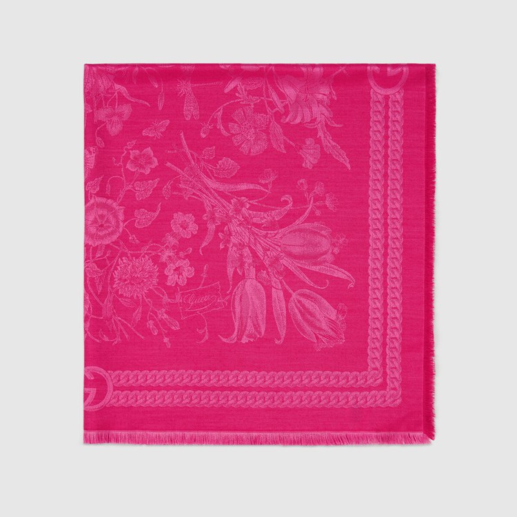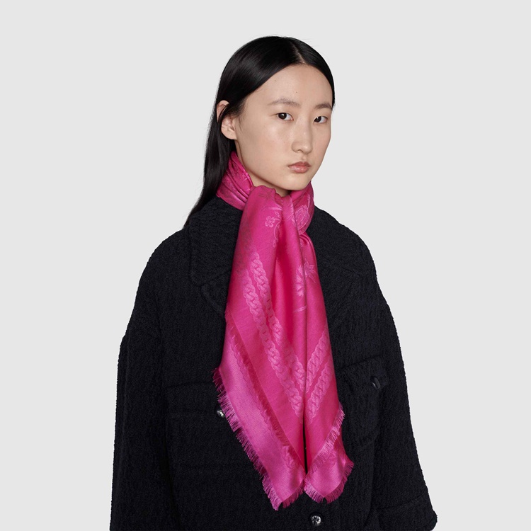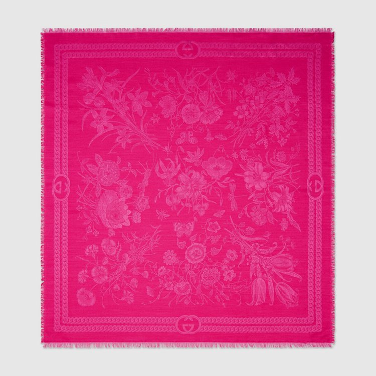Style 676320 3GAD7 5600 The historic Flora motif, first presented by Vittorio Accornero more than 50 years ago appears here as a light pink silk jacquard. Deepening The connection to Gucci’s heritage, The Interlocking G completes The scarf’s design as an intricate logo pattern. Pieces With versatile ways to wear and style embrace each person who is Part of The House’s individual spirit.