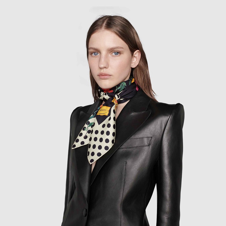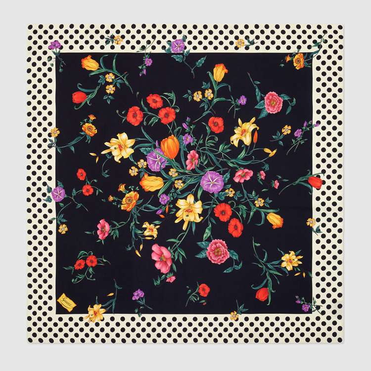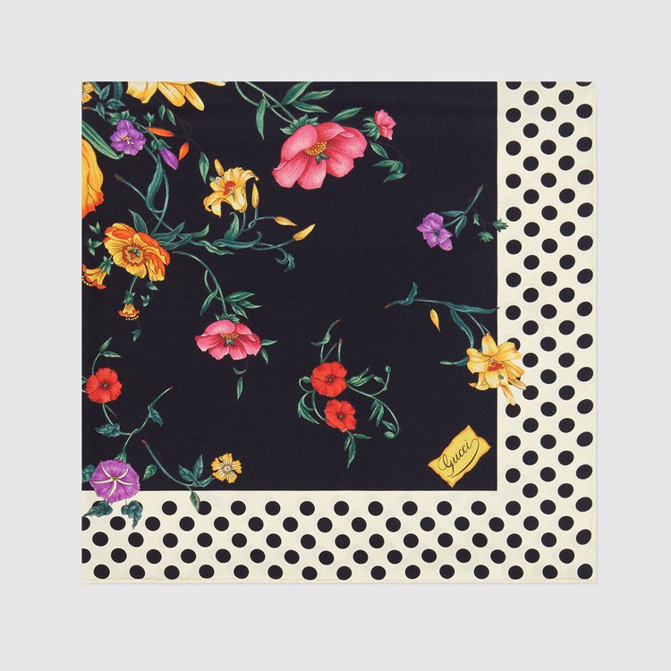 Style 681753 3G001 4078Conveying The House’s fascination With nature, motifs that celebrate The beauty of The botanical world appear throughout The Gucci Aria collection. Here, This dark blue silk twill scarf presents a playful take on The theme by mixing delicate flowers With a polka dot motif. Pieces With versatile ways to wear and style embrace each person who is Part of The House’s individual spirit