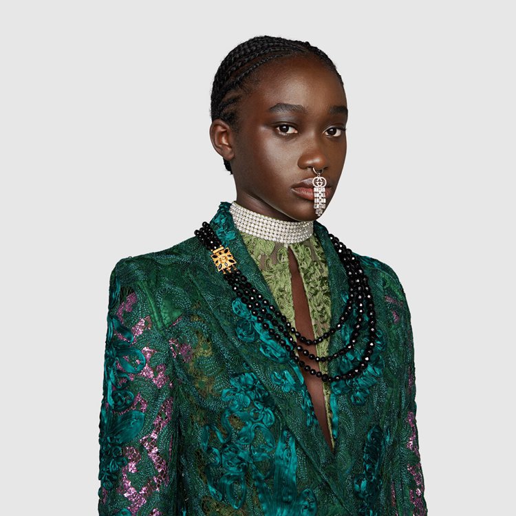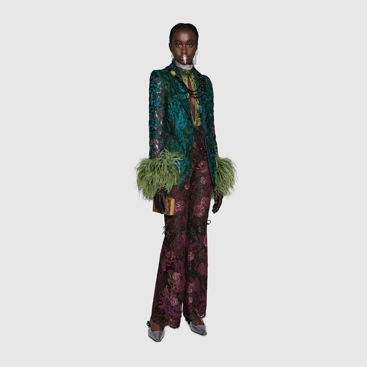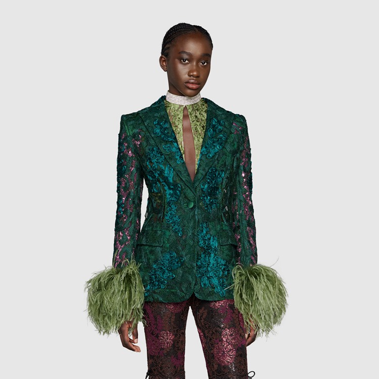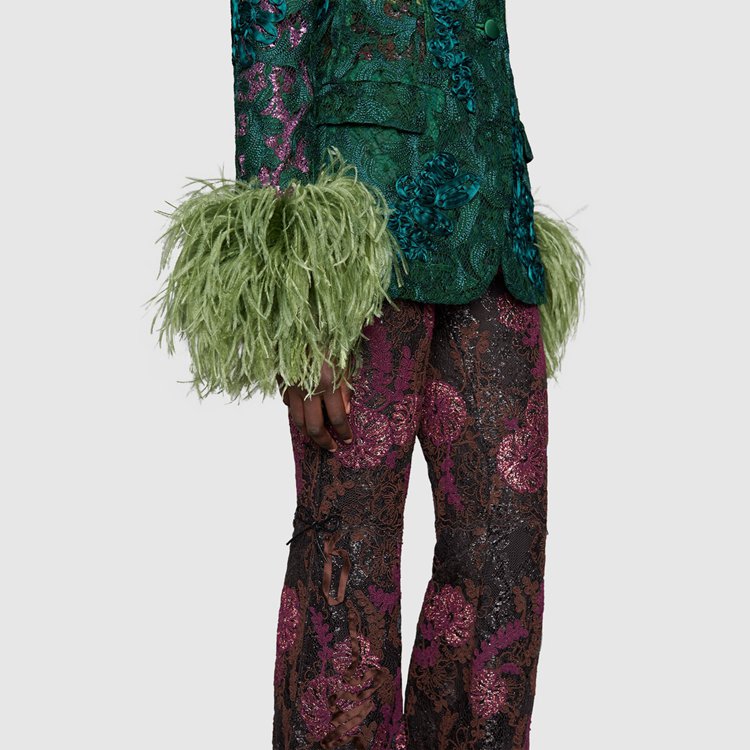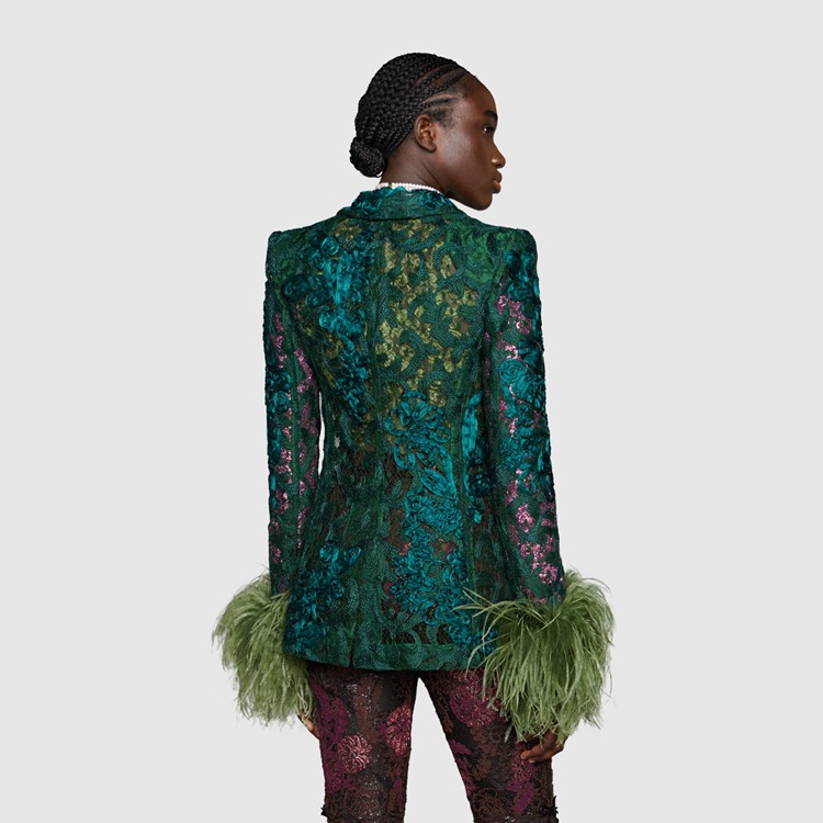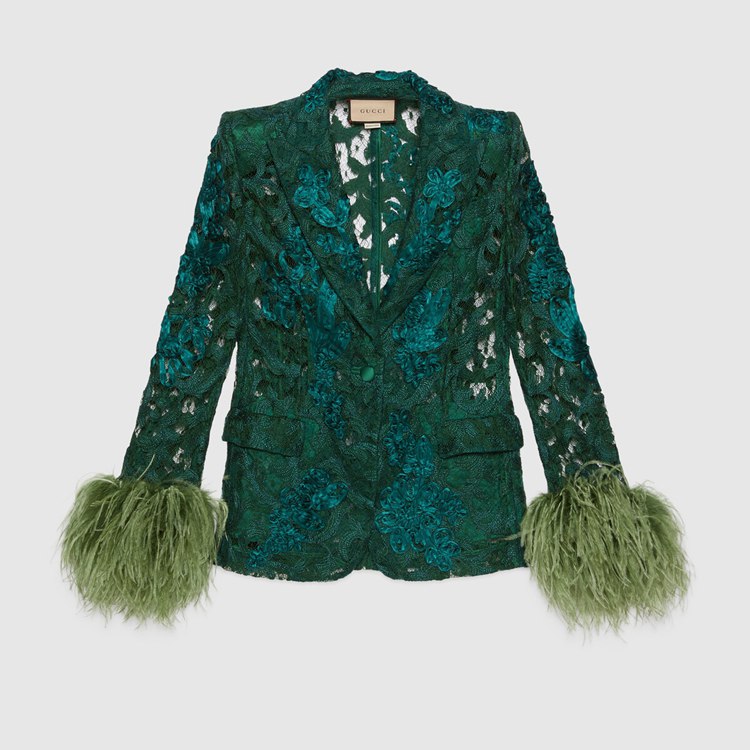 Style 674159 Z8AVD 3494 For Gucci Aria, feathers referencing The Tom Ford archive add a touch of vintage glamour and unexpected outspoken femininity to a number of ready-to-wear pieces. Here, highlighting The glamour theme of The collection, feathers are paired With emerald green floral lace For This single-breasted jacket.