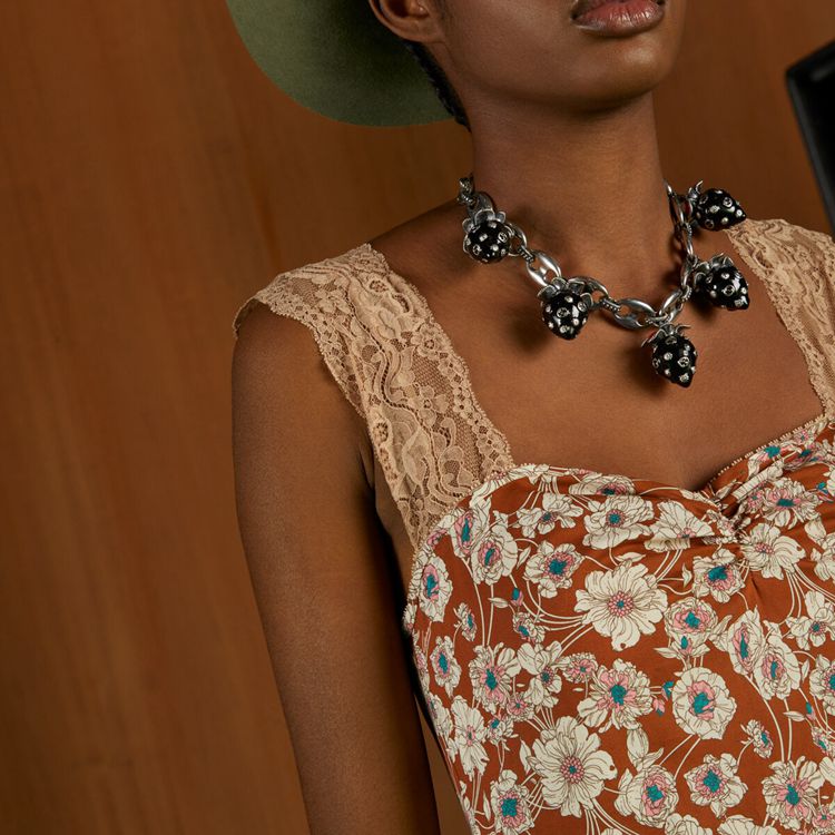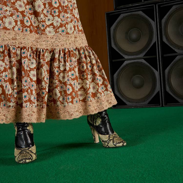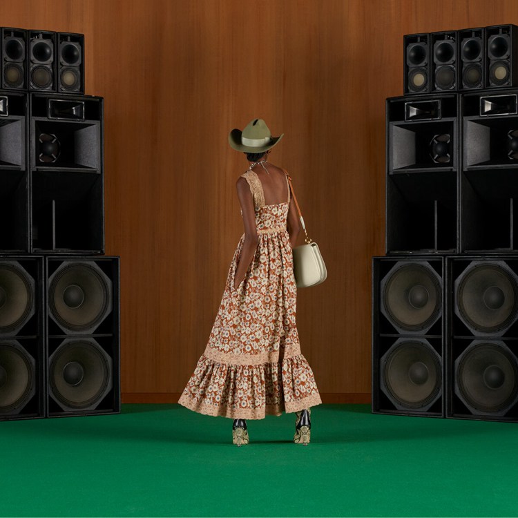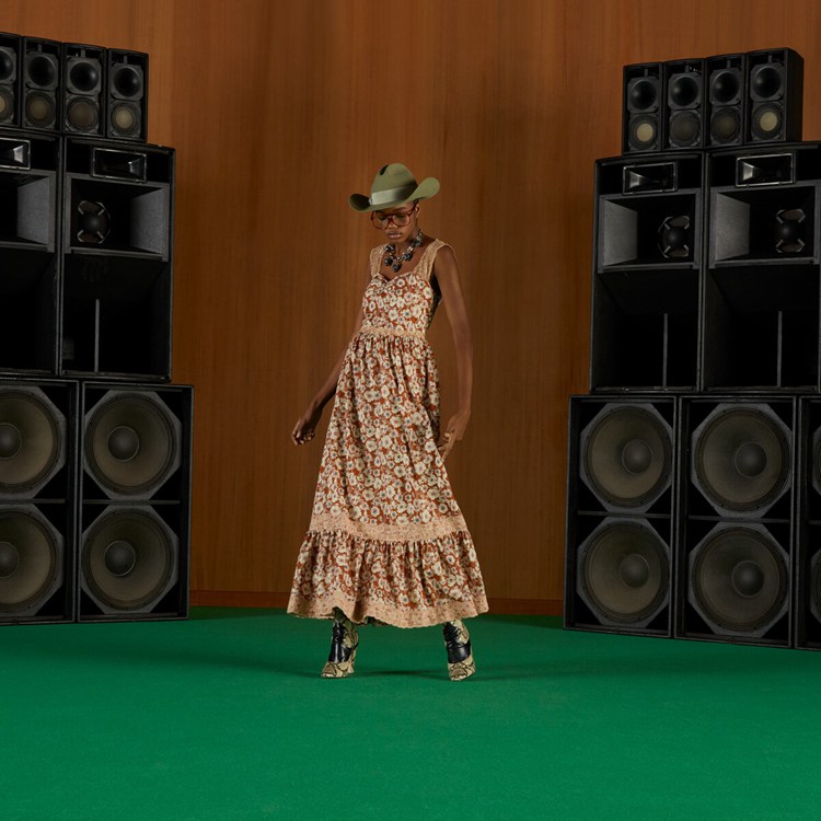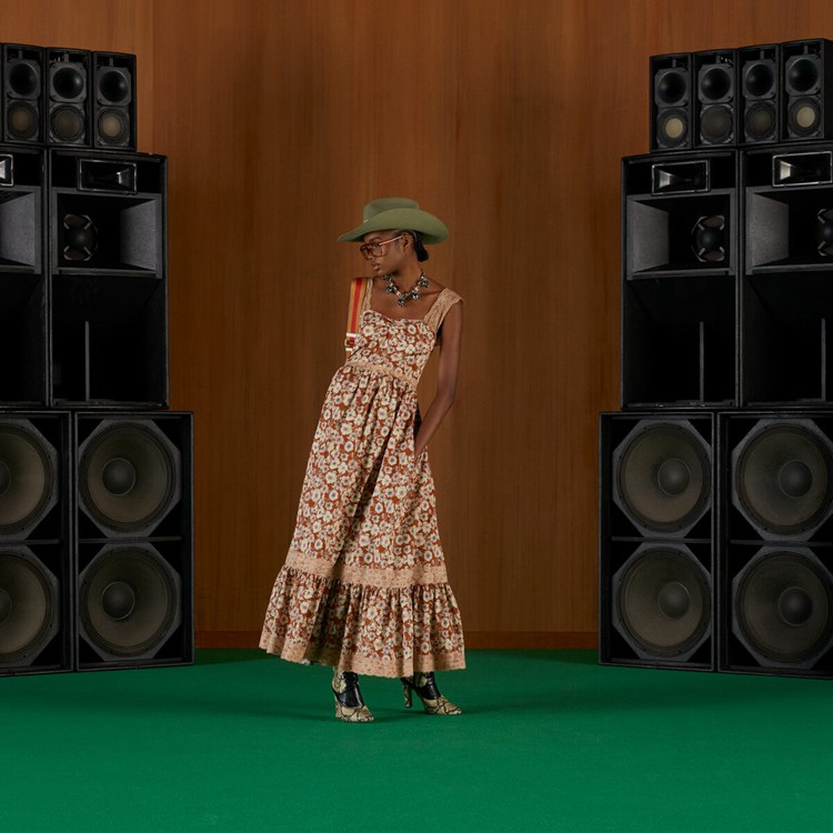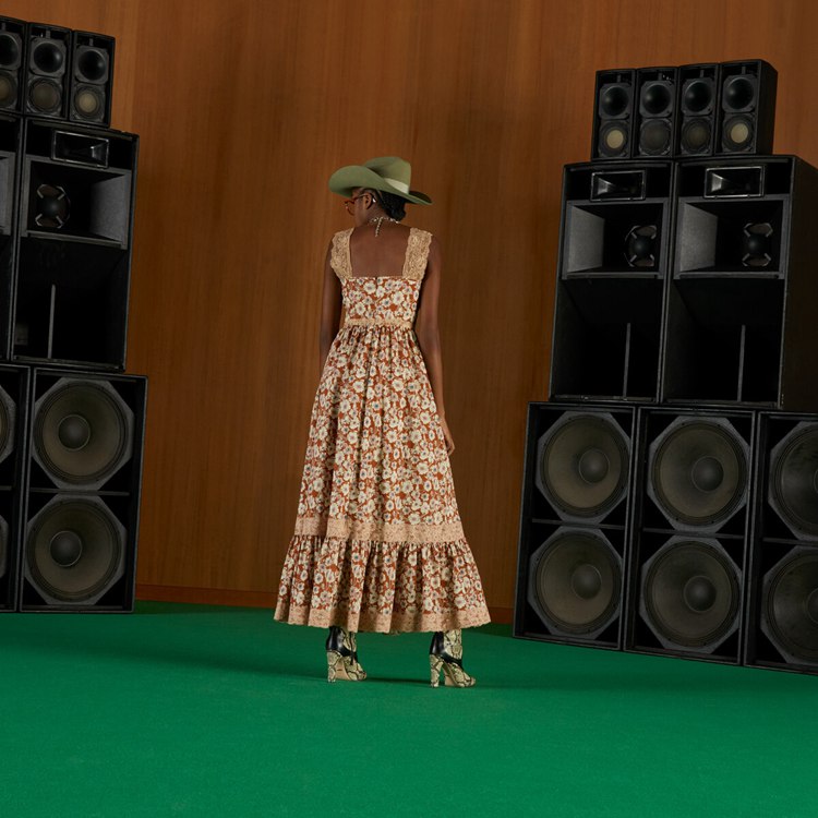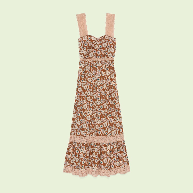 Style 699491 ZAJKH 2255 A long flowy silk dress featuring a whimsical floral print. The feeling of escapism experienced in The latest House’s collection finds its peak through Gucci Love Parade. Garments Inspired by long picnics on blooming fields appear in The collection through floral dresses enriched With lace details.