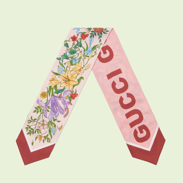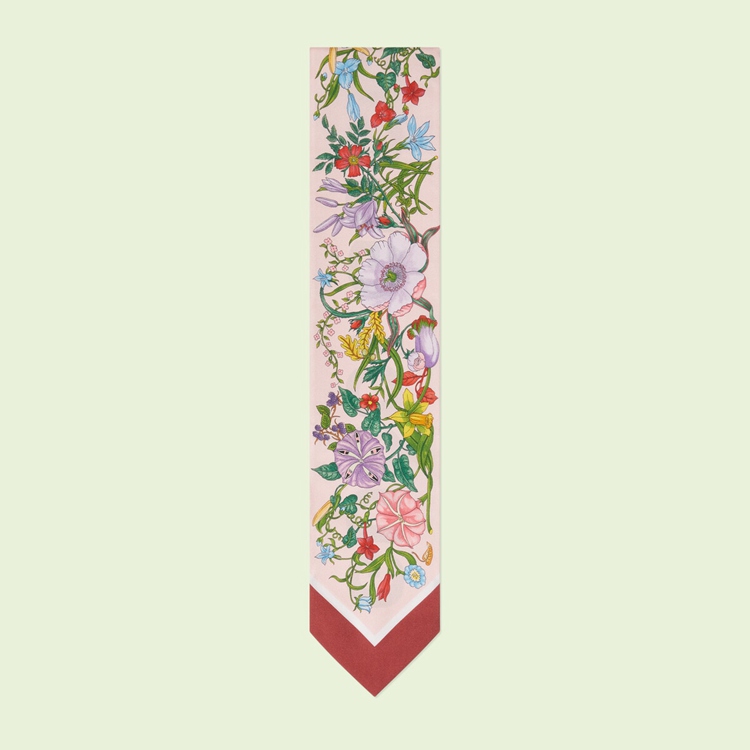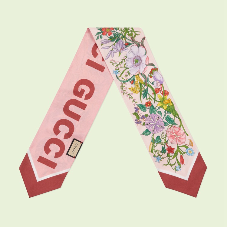 Style 700424 3G001 5800Archival Designs continue to be a source of inspiration For New collections. As Part of The Gucci Love Parade collection intricate botancial motifs have been repurposed through a contemporary lens. For This pink silk neck bow, signature floral patterns appear on One side, while The name of The House can be found in a modern, bold rendition on The back.