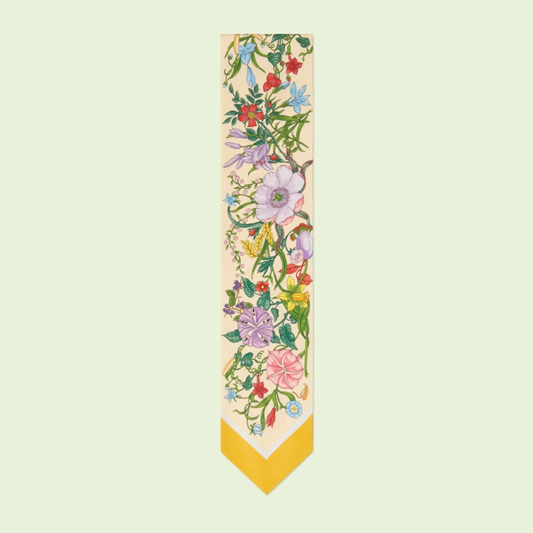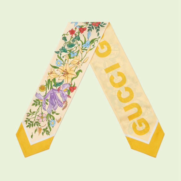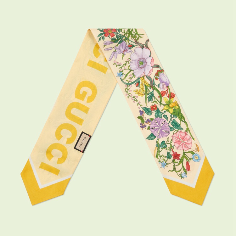 Style 700424 3G001 7400Archival Designs continue to be a source of inspiration For New collections. As Part of The Gucci Love Parade collection intricate botancial motifs have been repurposed through a contemporary lens. For This yellow silk neck bow, signature floral patterns appear on One side, while The name of The House can be found in a modern, bold rendition on The back.