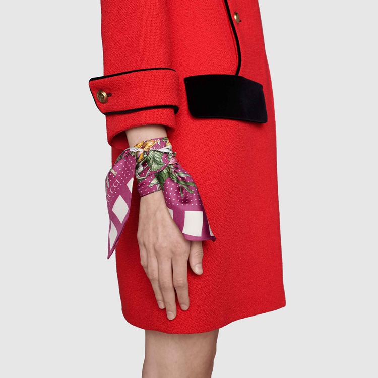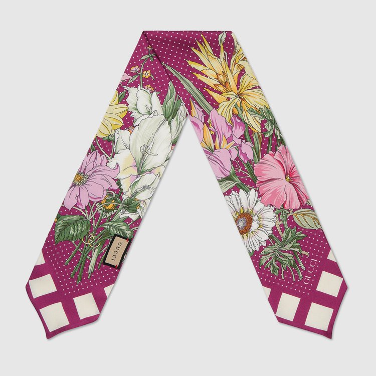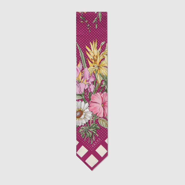 Style 682011 3G001 5278 Crafted from soft silk twill, This neck bow is animated by a delicate floral pattern against a vibrant shade of violet. A square pattern trim completes The style, adding an eye-catching design detail. Pieces With versatile ways to wear and style embrace each person who is Part of The House’s individual spirit