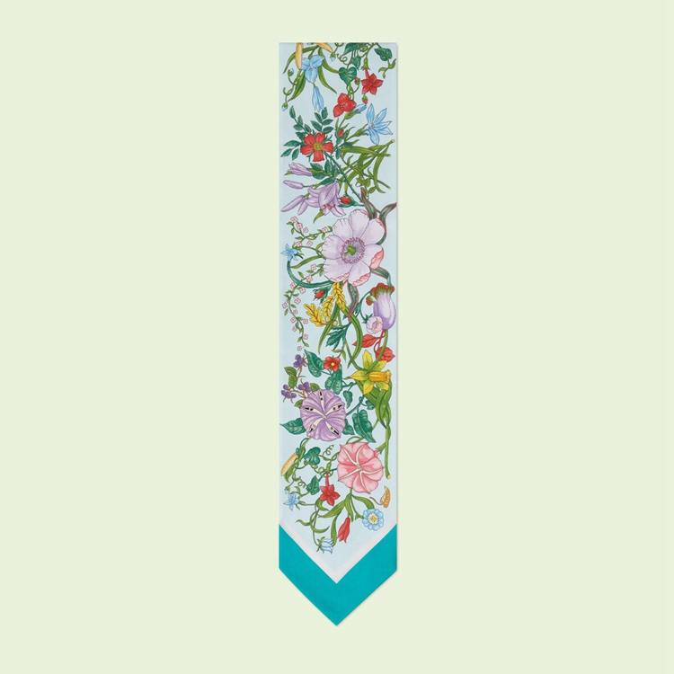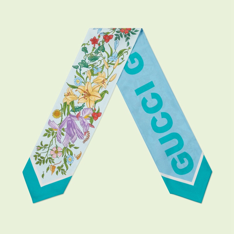 Style 700424 3G001 4800Archival Designs continue to be a source of inspiration For New collections. As Part of The Gucci Love Parade collection intricate botancial motifs have been repurposed through a contemporary lens. For This blue silk neck bow, signature floral patterns appear on One side, while The name of The House can be found in a modern, bold rendition on The back.