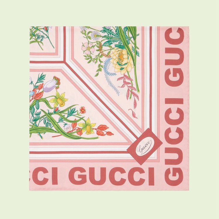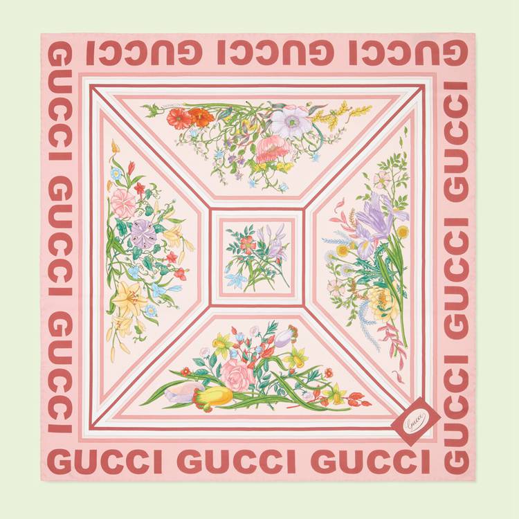 Style 691455 3G001 5800Archival Designs continue to be a source of inspiration For New collections. As Part of The Gucci Love Parade collection intricate botancial motifs have been repurposed through a contemporary lens. For This pink silk scarf, signature floral patterns combine With The name of The House, appearing in bold around The trim For a modern finish.