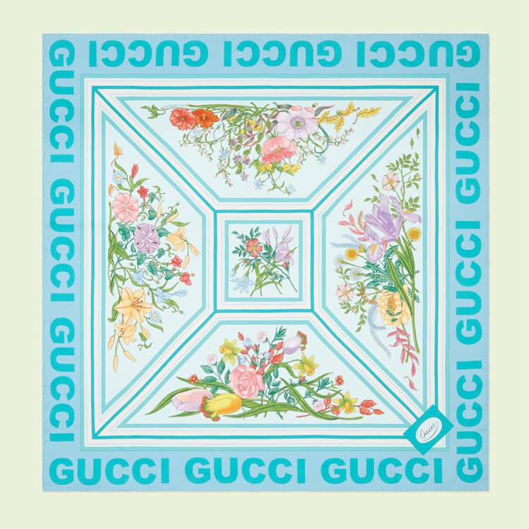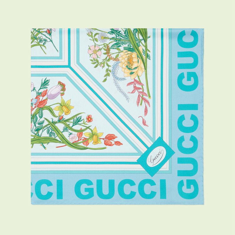 Style 691455 3G001 4800Archival Designs continue to be a source of inspiration For New collections. As Part of The Gucci Love Parade collection intricate botancial motifs have been repurposed through a contemporary lens. For This blue silk scarf, signature floral patterns combine With The name of The House, appearing in bold around The trim For a modern finish.