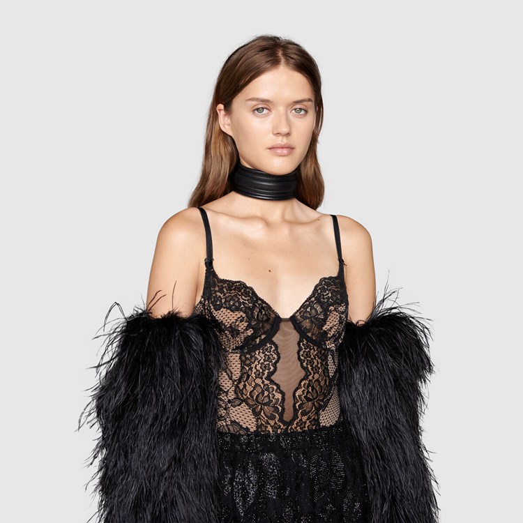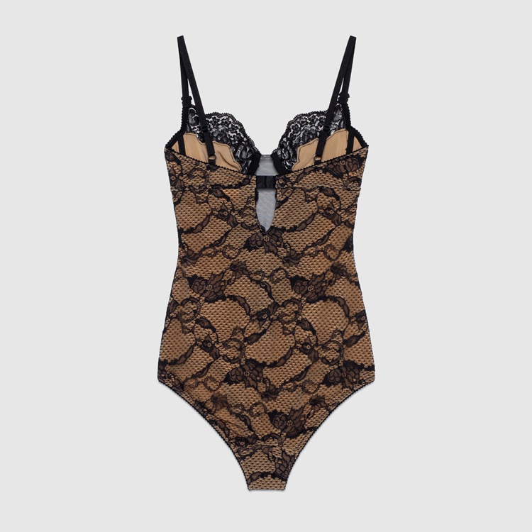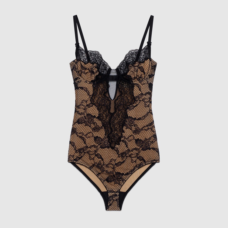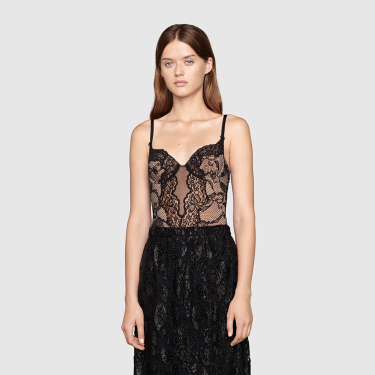 Style 682707 XUAC1 1000 The wild beauty of The natural world continues to inspire The Creative Director’s latest creations. Crafted from black lace, This bodysuit is characterized by an intricate allover floral pattern that channels This inspiration.