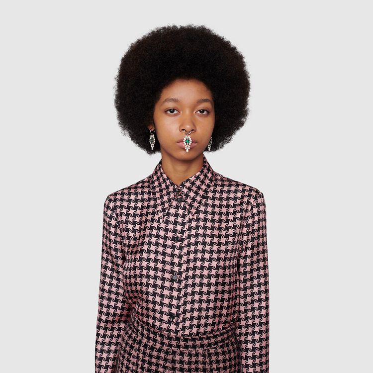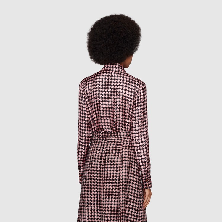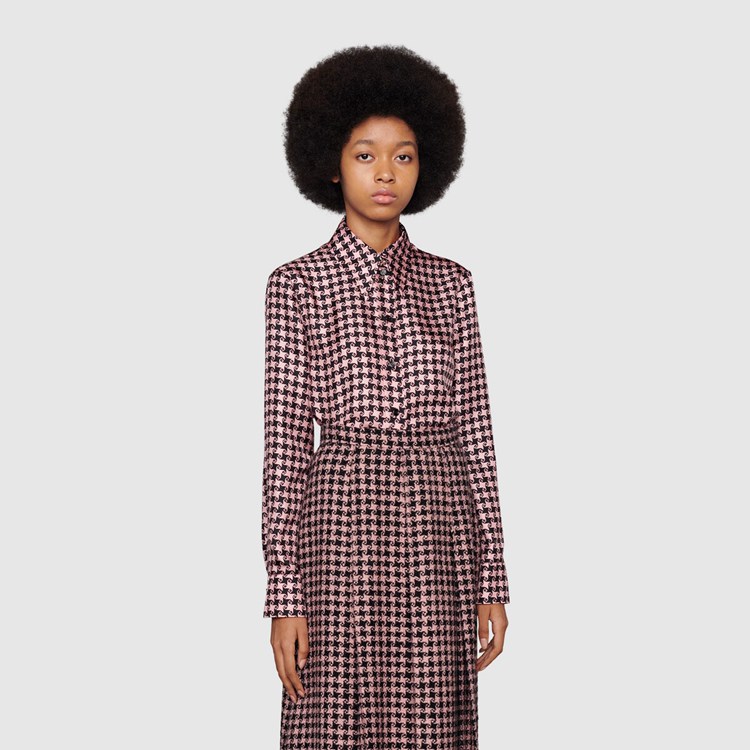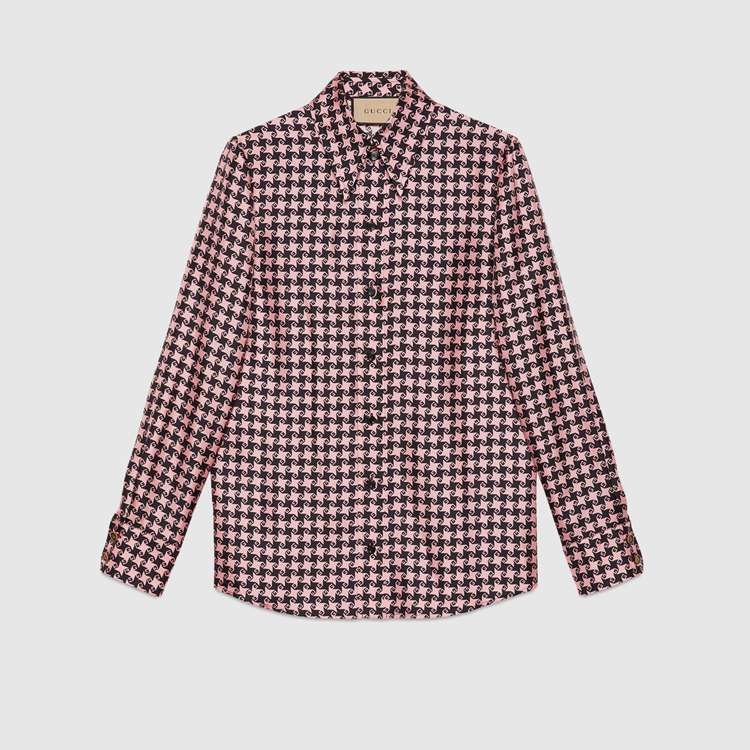 Style 675825 ZAH3U 5322 A reference to The initials of The House’s Founder Guccio Gucci, The G square motif mixes With a houndstooth print defining This silk shirt. The preppy influence seen throughout The House narrative continues to evolve With colorful houndstooth motifs created For The Aria collection.