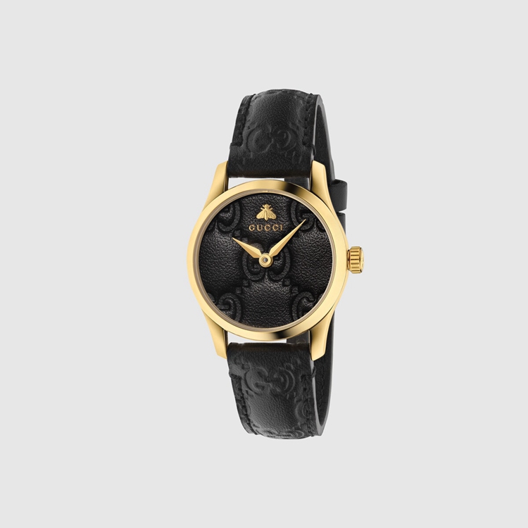 • Yellow gold PVD case, black Gucci Signature leather dial and strap