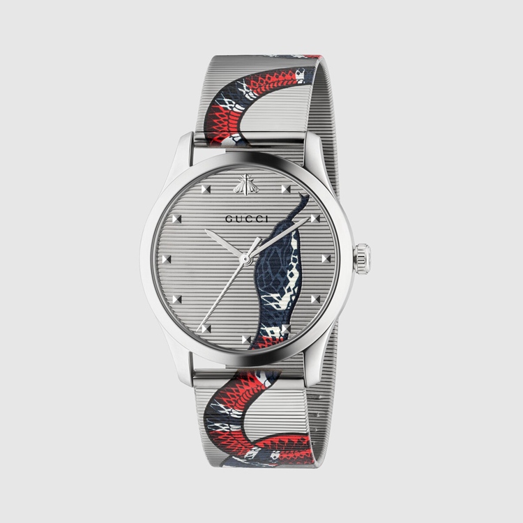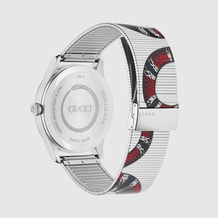 Style 584145 I1600 8561 The Kingsnake, One of The symbolic animals that is associated With The House, is printed on This G-Timeless watch, slithering along The steel mesh bracelet and continuing onto The center dial.