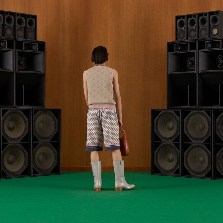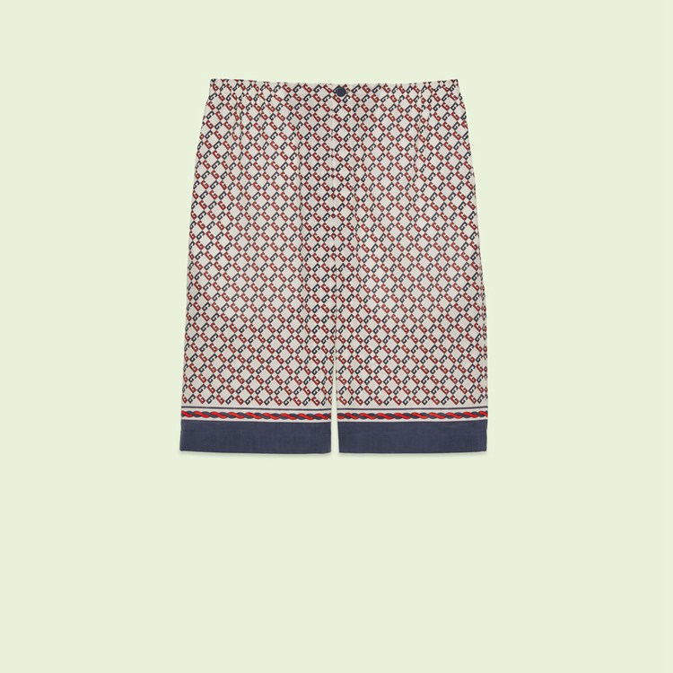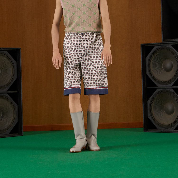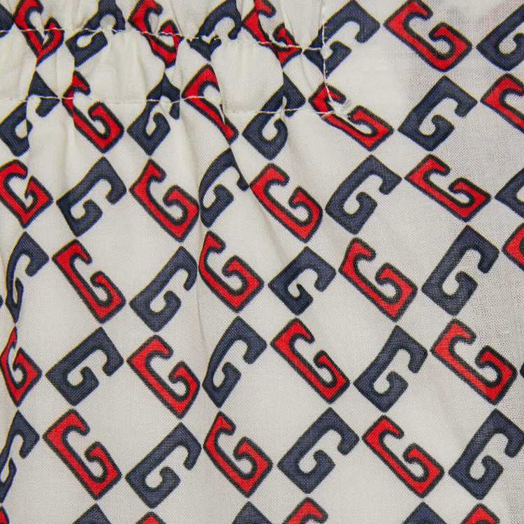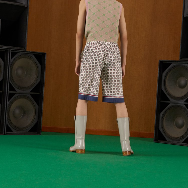 Style 672698 ZAIZY 9093Archival details continue to evolve For a subtle logo presence throughout Gucci’s latest collections. Presented in contrasting shades, The geometric G print portrays a graphic design that references The House name. The motif defines ivory muslin shorts.