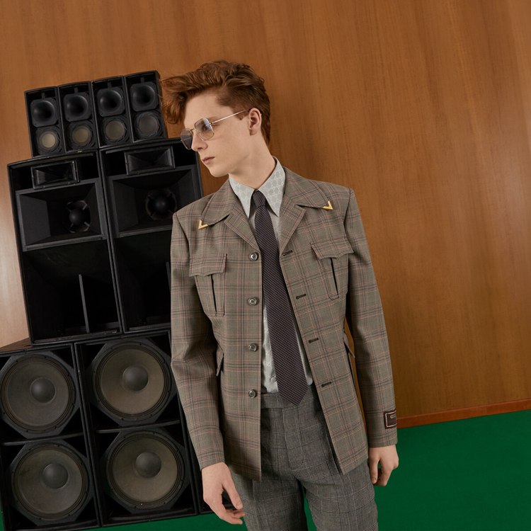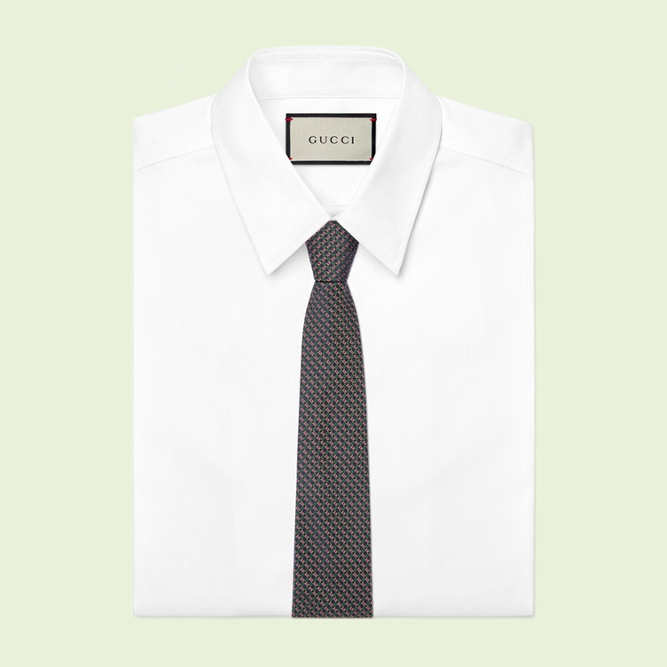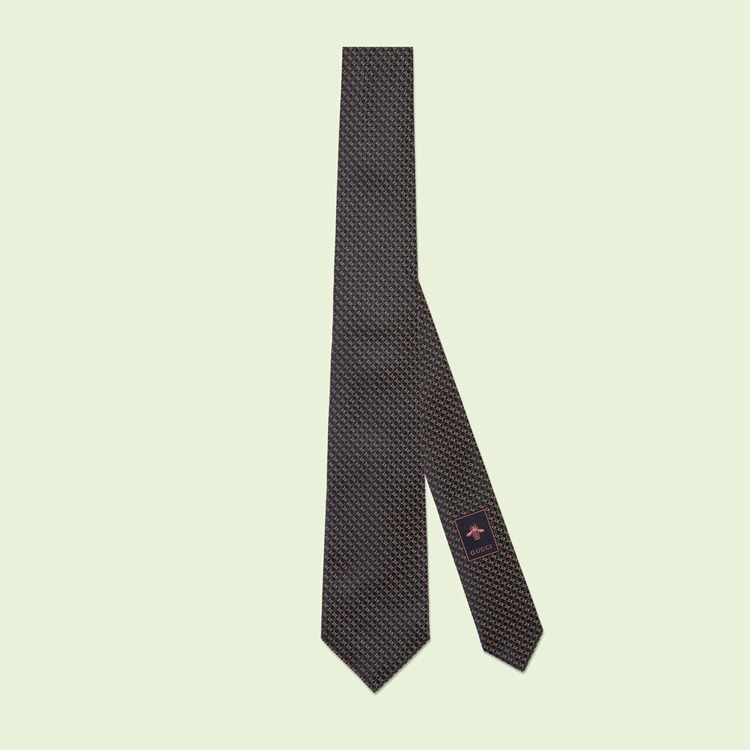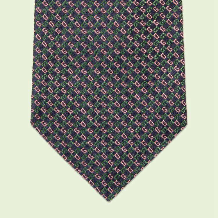 Style 699663 4E002 4172 The Geometric G continues to be woven throughout The Gucci narrative, enhancing styles With a Retro influence. The House emblem decorates This navy silk jacquard tie in a playful pink and green colorway.