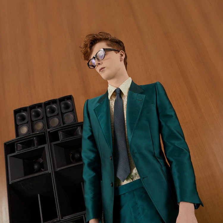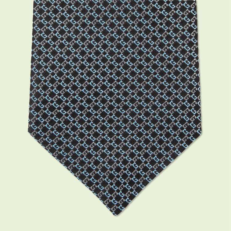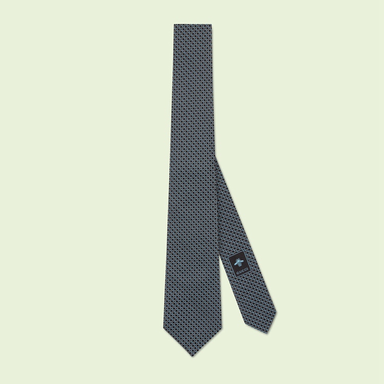 Style 699663 4E002 4069 The Geometric G continues to be woven throughout The Gucci narrative, enhancing styles With a Retro influence. The House emblem decorates This silk jacquard tie in an alternating dark and light blue colorway.