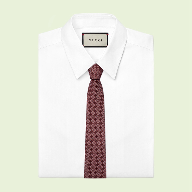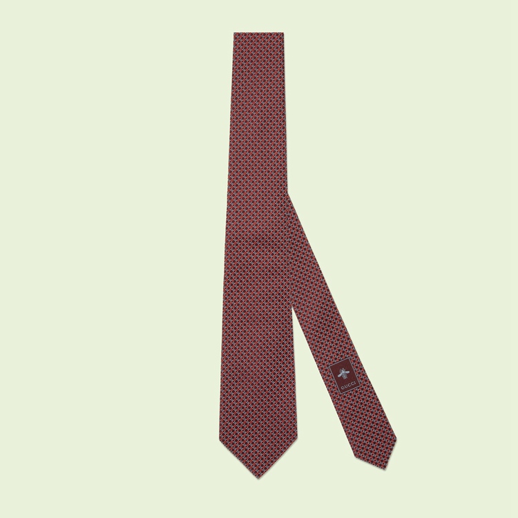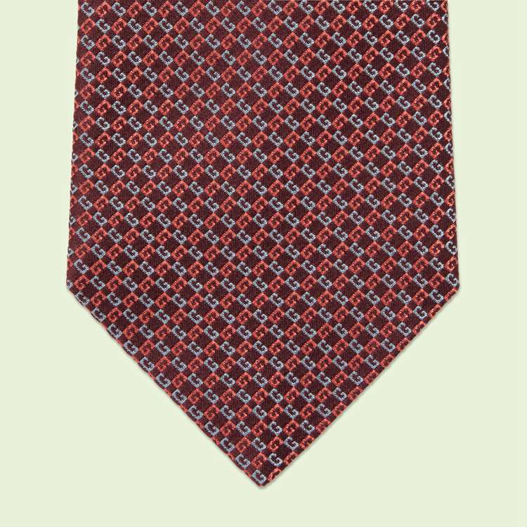 Style 699663 4E002 6274 The Geometric G continues to be woven throughout The Gucci narrative, enhancing styles With a Retro influence. The House emblem decorates This silk jacquard tie in an alternating red and light blue colorway.