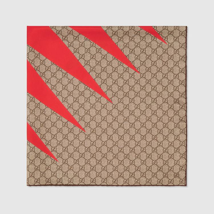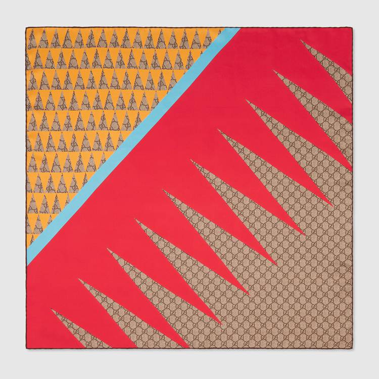 Style 681655 3G001 9774 This item features bright and colorful geometric motifs that recall The uniforms worn by horse riding jockeys. The collection is Inspired by The Parade Ring, or paddock, where horses walk around as a warm-up before The race and to help racegoers pick a winner. Here a vibrant print, resembling a flame, enriches This twill scarf.