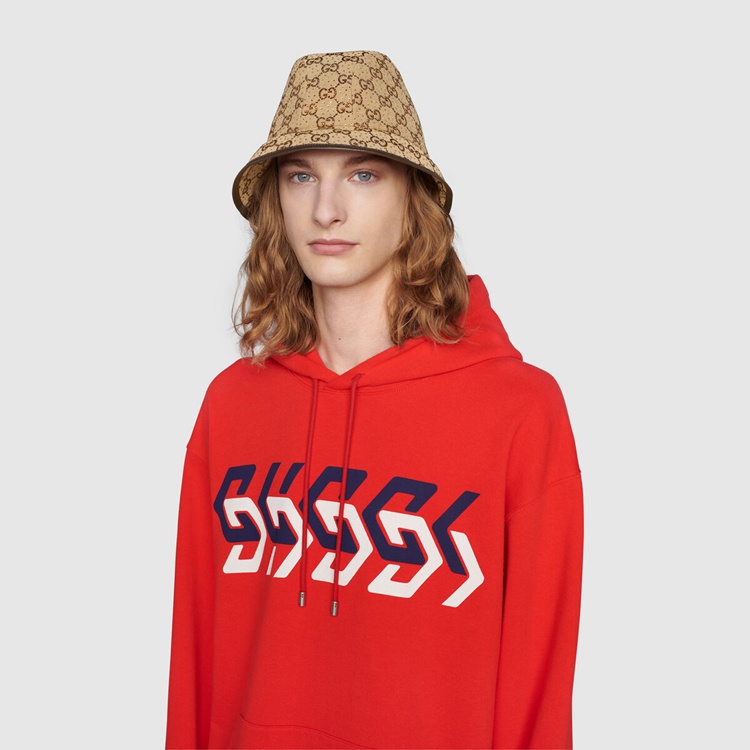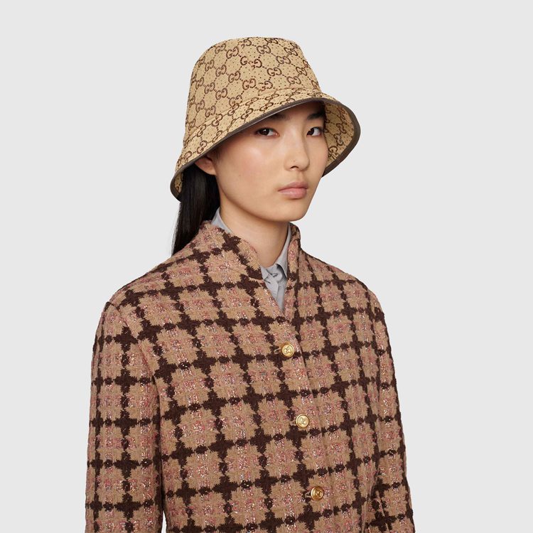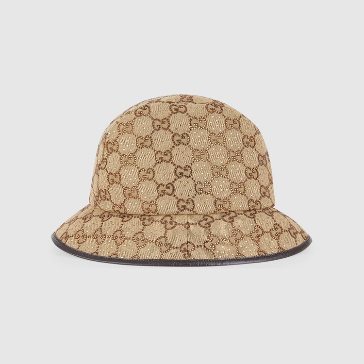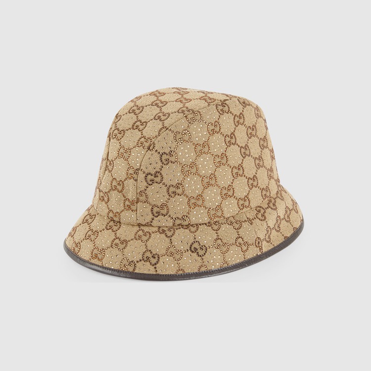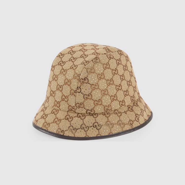 Style 679426 3HAFX 2564 Instantly recognizable emblems of The brand, logos enrich Designs in New and unexpected ways. Behind every logo lies The tradition and value of The House, an everlasting medium One can wear again and again. Here, The GG canvas is reimagined With sparkling crystals decorating The camel and ebony bucket hat. A brown leather trim completes The style.