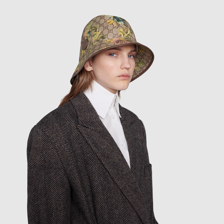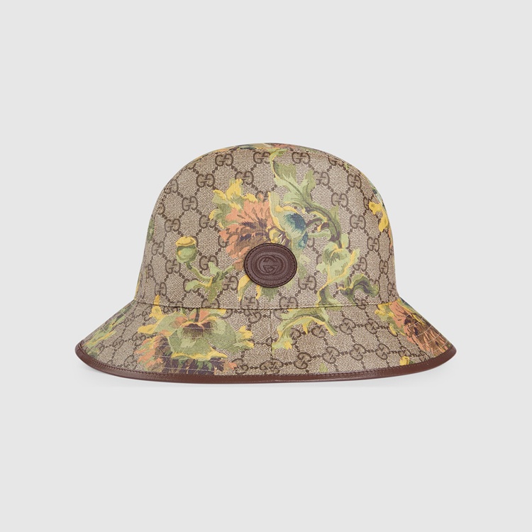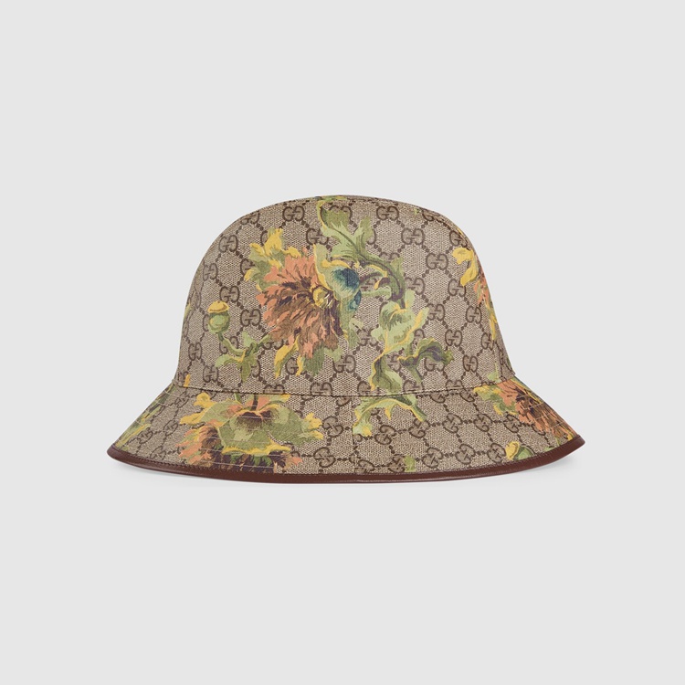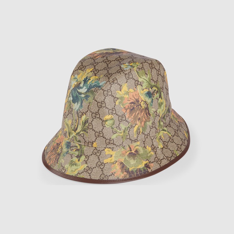 Style 677220 4HAK8 8964 The signature beige and ebony GG Supreme canvas defines This bucket hat, paired With a delicate carnation floral pattern in neutral tones. As a heritage material, The monogram canvas deepens The accessory’s connection to The House’s history.