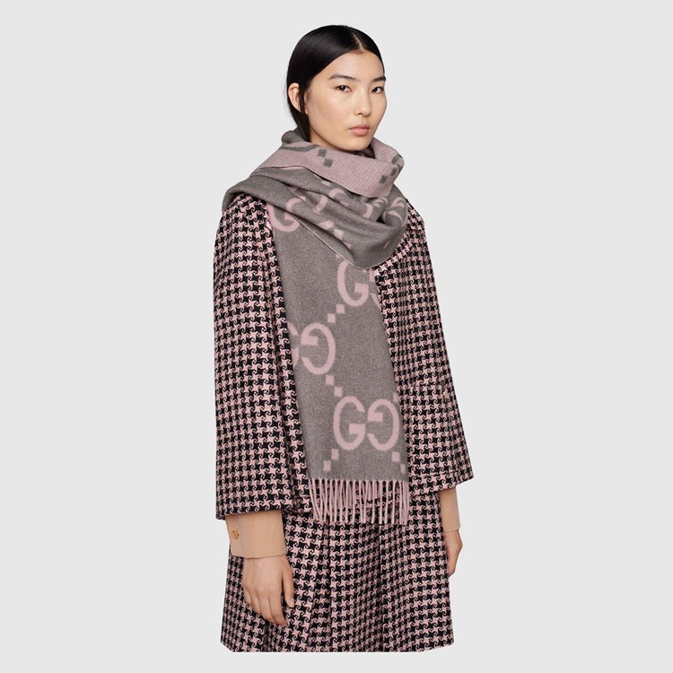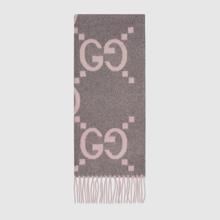 Style 674275 3G344 1272Presented in a contrasting Color combination of grey and pink, The initials of The Founder Guccio Gucci alternate across This soft cashmere jacquard scarf. Timeless pieces continue to elevate The House’s most Emblematic creations.