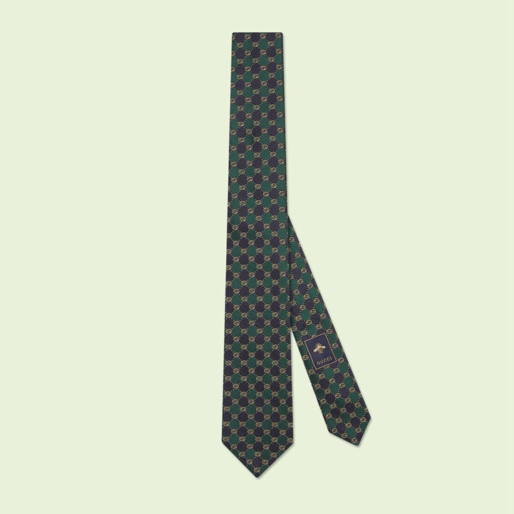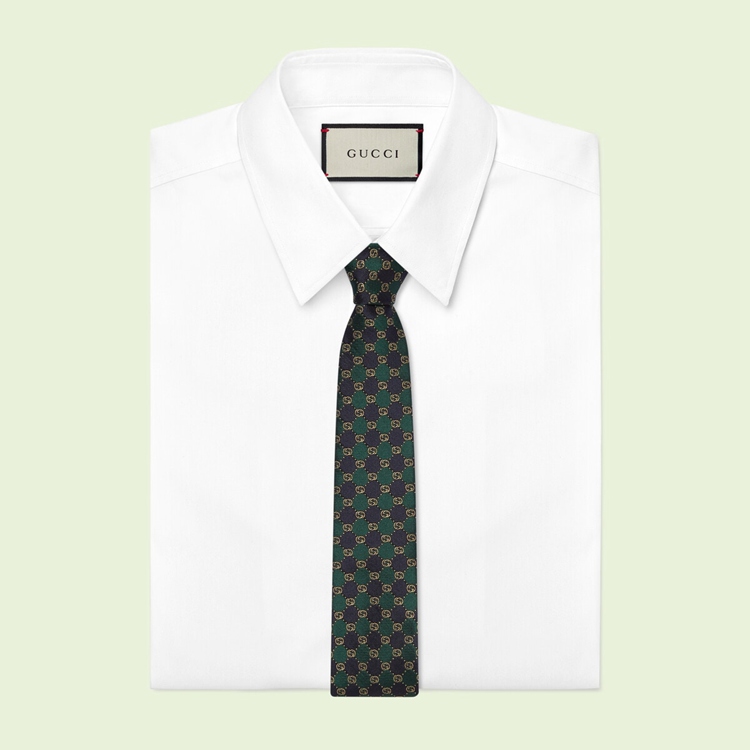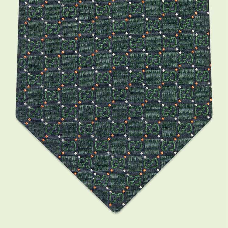 Style 695315 4E002 3167Unmistakable House symbols appear alongside distinctive patterns, enriching each New collection With original and eye-catching designs. This silk jacquard tie presents a tonal green GG check motif.