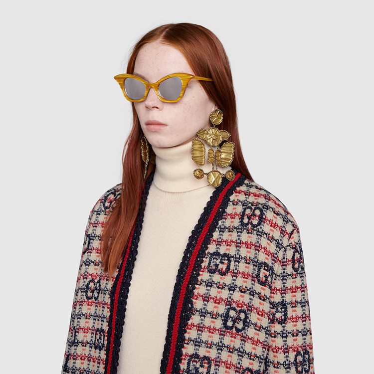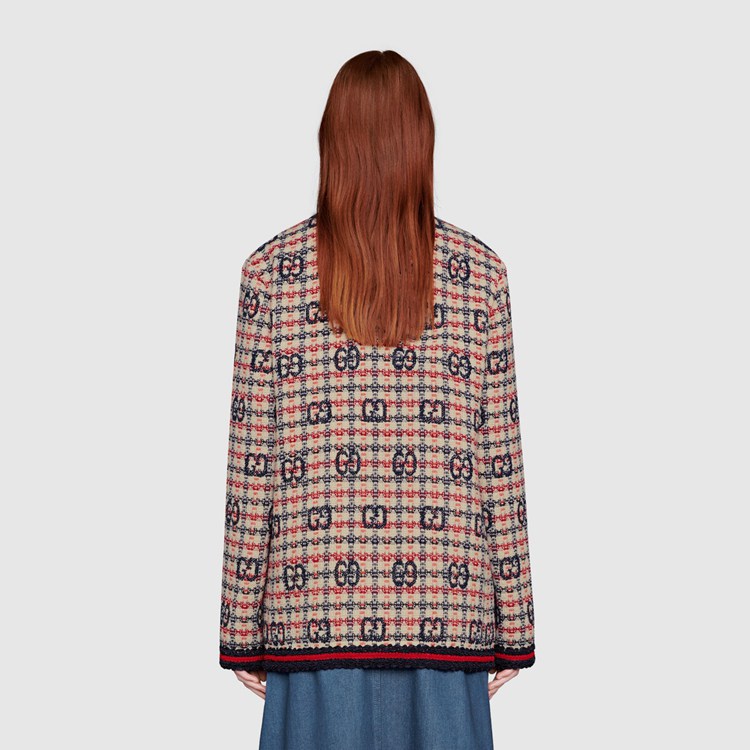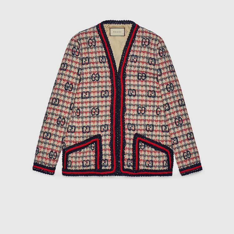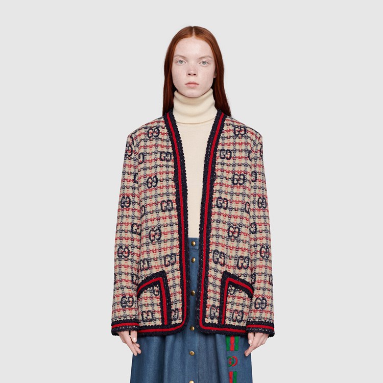 Style 610060 ZADEH 4069Reminiscent of a cardigan design, This tweed jacket has an open front and diagonal patch pockets. In a Color combination that recalls The Sylvie Web, The blue, white and red check mixes With The GG pattern. Imbued With an inherent ladylike feel, tweed defines The House’s collections, from traditional shapes to unexpected, contemporary designs.